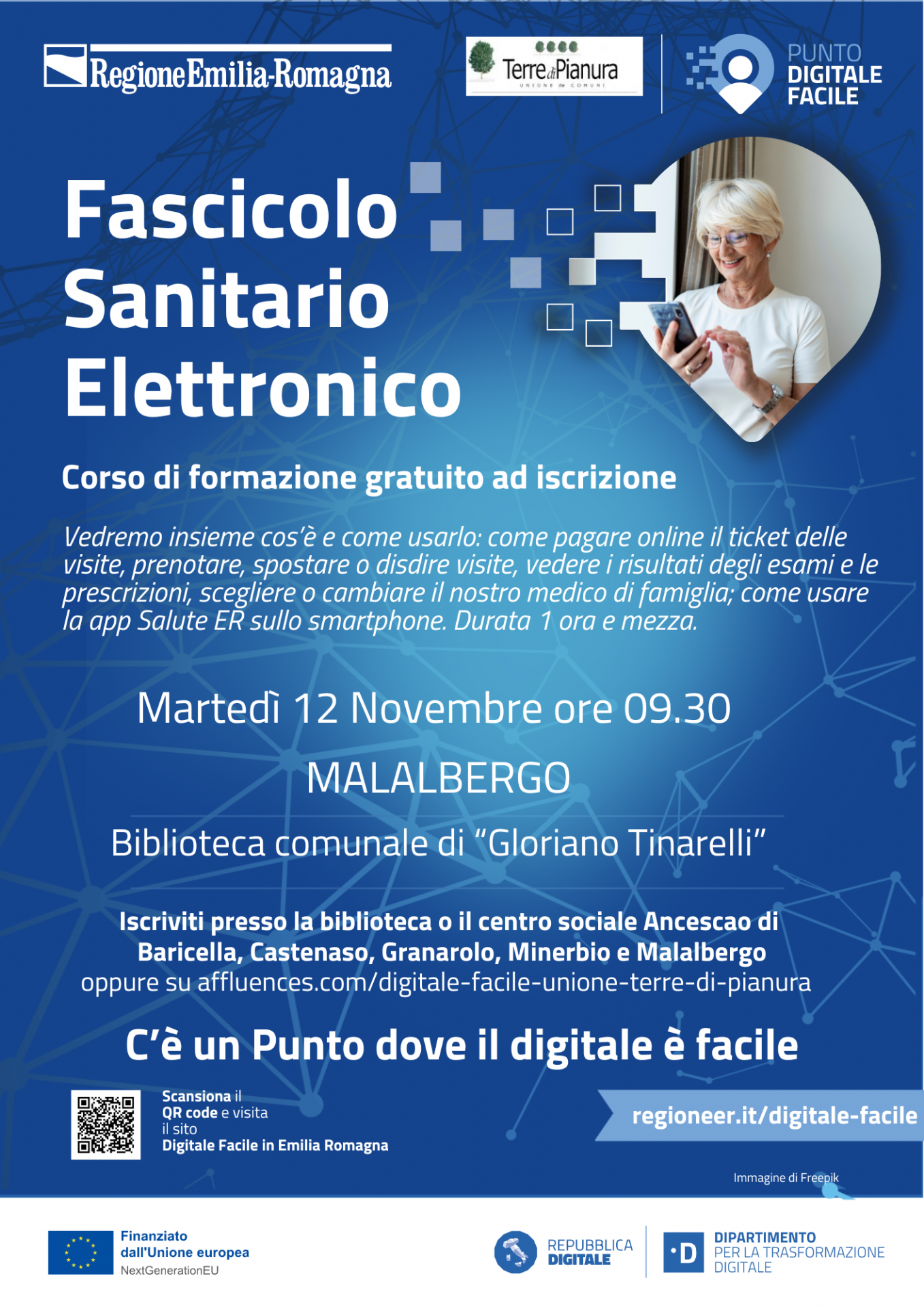 Martedì 12 Novembre alle ore 09.30 presso la Biblioteca comunale Gloriano Tinarelli si svolgerà il Corso di formazione gratuito del Punto Digitale Facile sul FASCICOLO SANITARIO ELETTRONICO.