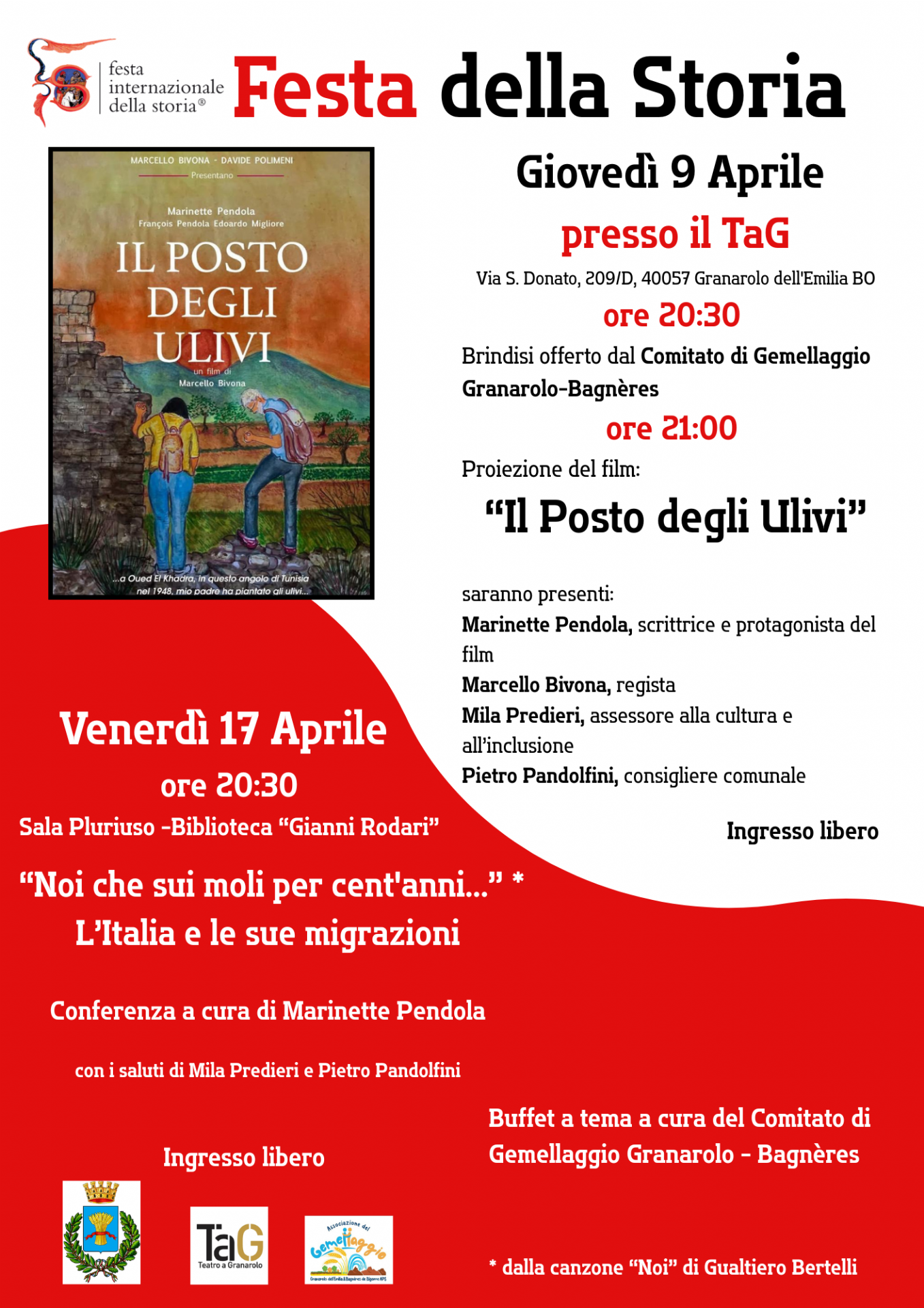 Il primo evento è in programma giovedì 9 aprile presso il TaG – Teatro a Granarolo (via San Donato 209/D). La serata si aprirà alle ore 20:30 con un brindisi offerto dal Comitato di Gemellaggio Granarolo-Bagnères, seguito alle ore 21:00 dalla proiezione del film “Il Posto degli Ulivi”.