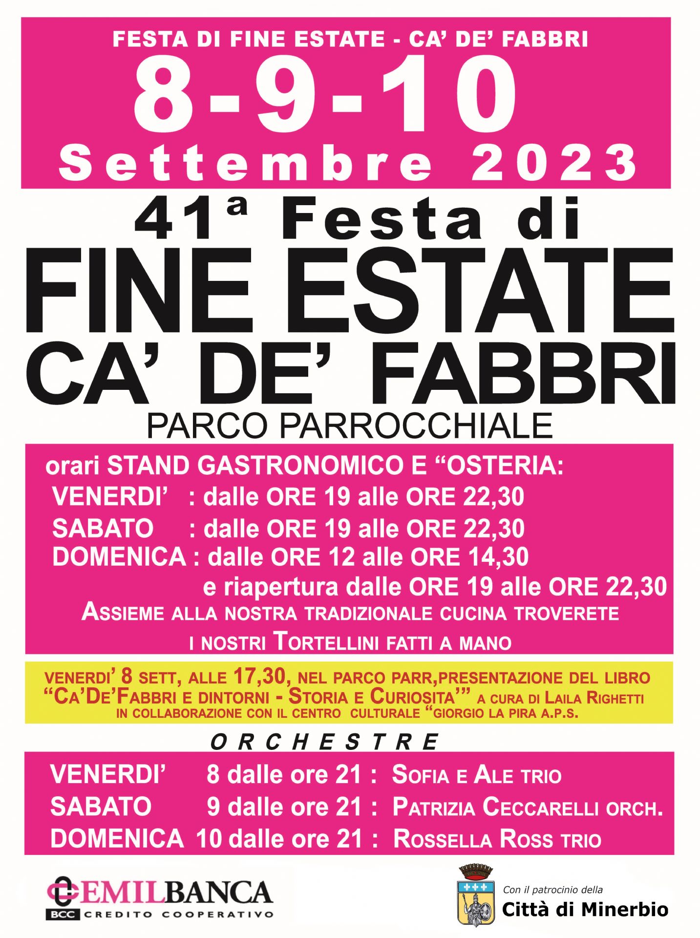 Dall'8 al 10 settembre 2023 si svolgerà la 41ᵃ festa di fine estate di Ca' de' Fabbri nel parco parrocchiale.