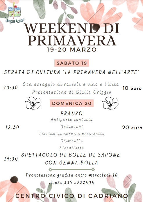 Sabato 19 e domenica 20 marzo Campus Adriani organizza, presso il centro civico di Cadriano, il "Fine settimana di primavera".