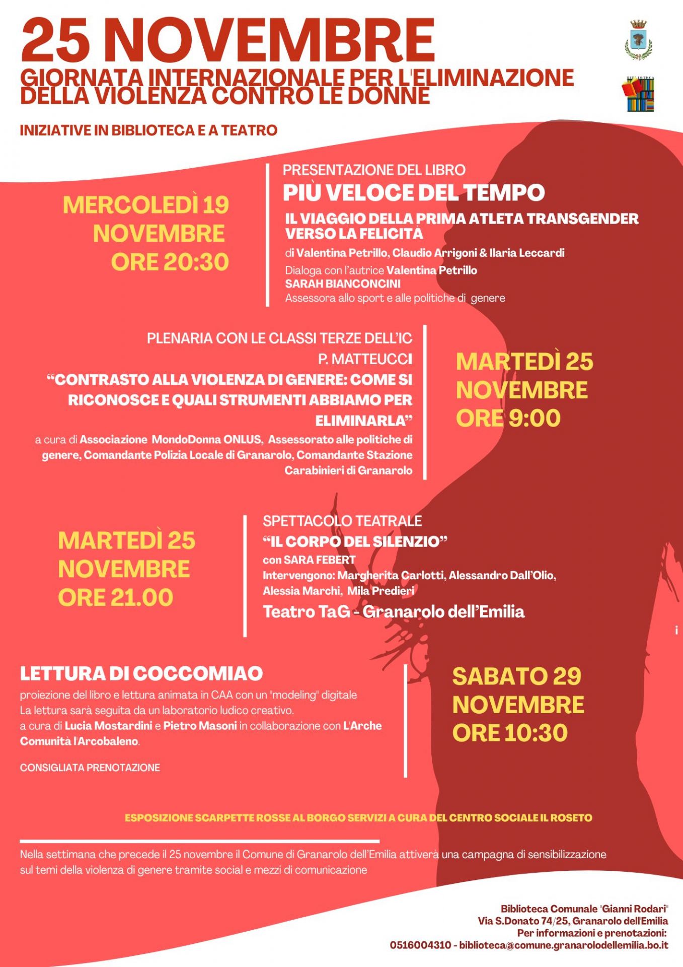 • Sabato 29 novembre – ore 10.30 Lettura animata “Coccomiao” Proiezione del libro e lettura in CAA con “modeling” digitale, seguita da un laboratorio ludico-creativo. A cura di Lucia Mostardini e Pietro Masoni, in collaborazione con L’Arche Comunità l’Arcobaleno. Consigliata la prenotazione. Installazioni e sensibilizzazione sul territorio Nel corso della settimana precedente al 25 novembre sarà allestita, presso il Borgo Servizi, l’esposizione delle scarpette rosse a cura del Centro Sociale Il Roseto: un simbolo forte e riconosciuto della lotta contro la violenza sulle donne.