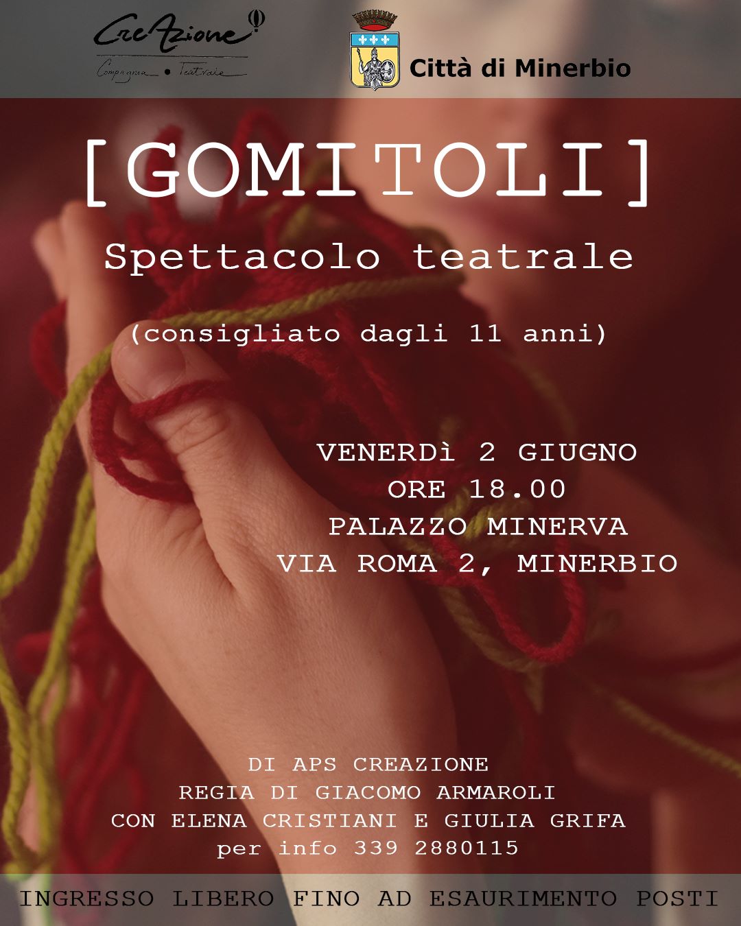 Venerdì 2 giugno 2023 alle ore 18.00 la compagnia teatrale CreAzione porta in scena a Palazzo Minerva (via Roma, 2 Minerbio) lo spettacolo GOMITOLI, consigliato ai giovani dagli 11 anni.