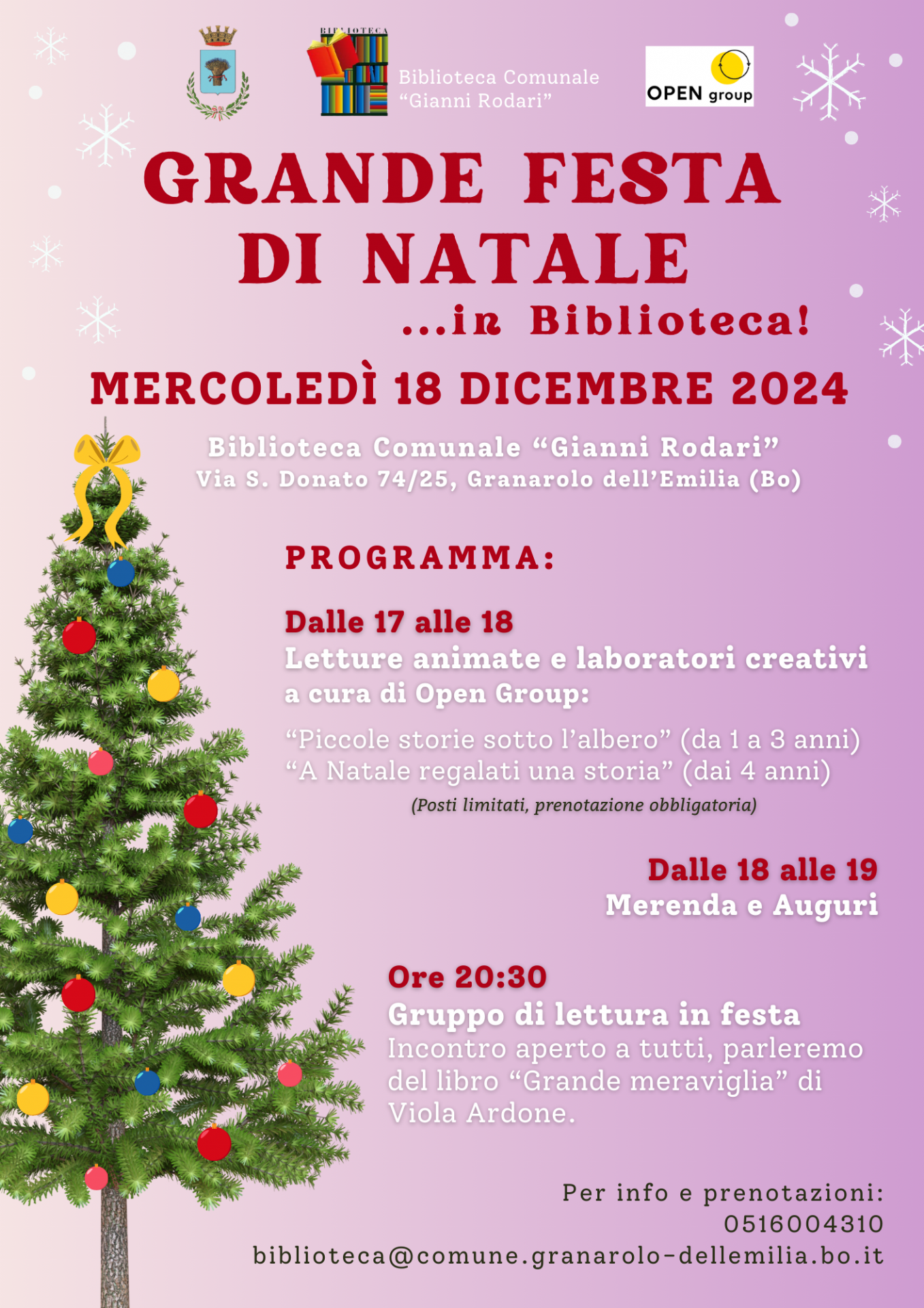 La Biblioteca Comunale “Gianni Rodari” di Granarolo dell’Emilia si prepara a festeggiare il Natale con un evento imperdibile per grandi e piccini. Mercoledì 18 dicembre 2024 vi aspettiamo in Via S. Donato 74/25 per un pomeriggio ricco di attività.