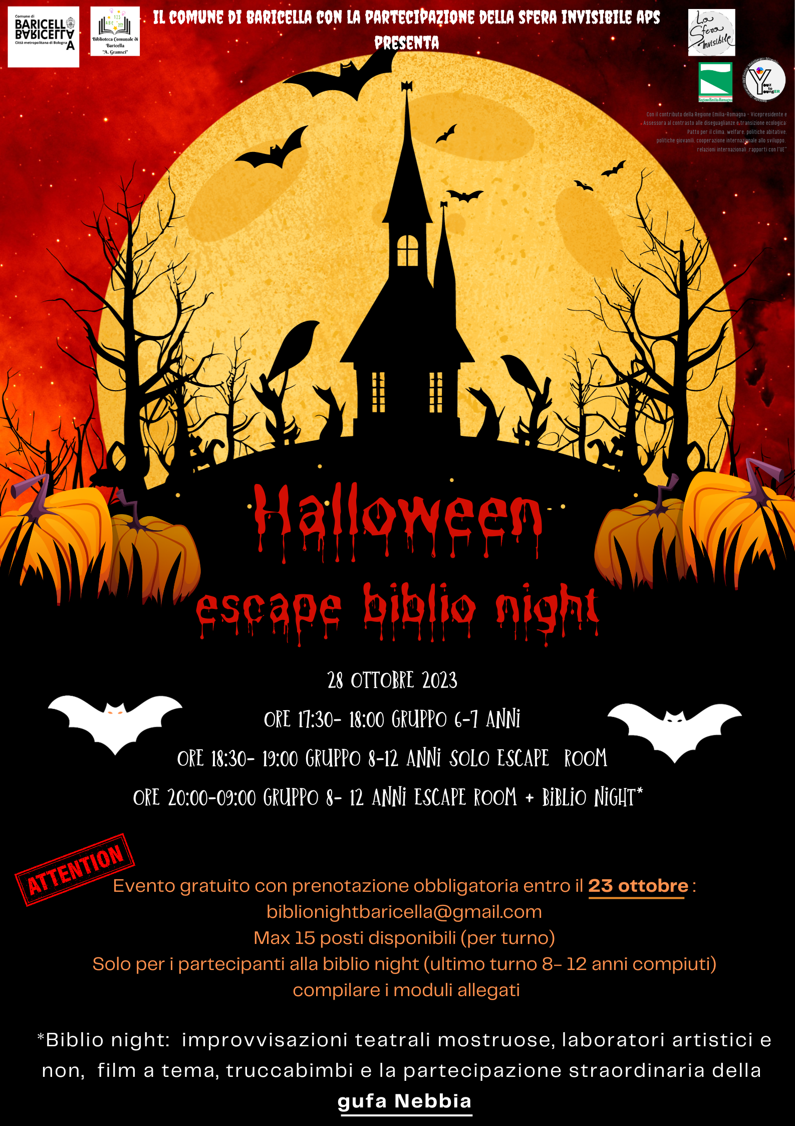 Prenotazione obbligatoria entro il 23 ottobre (o comunque fino ad esaurimento posti) scrivendo a biblionightbaricella@gmail.com. Il progetto vedrà il coinvolgimento attivo degli attori del corso teatrale della Sfera invisibile ASP che interpreteranno i mostri e le streghe che proveranno a spaventare i bambini.