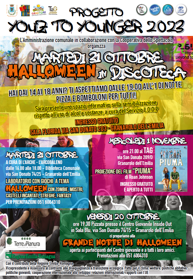 L’Amministrazione comunale, in collaborazione con la Cooperativa dello Spettacolo, organizza martedì 31 ottobre "Halloween in discoteca", uno straordinario evento a ingresso gratuito riservato alle ragazze e ai ragazzi dai 14 ai 18 anni. Si ballerà in Sala Florida (via San Donato 203, dalle 19 all'1 di notte). Pizza e bomboloni per tutti! Sarà anche presente uno spazio informativo sulla sensibilizzazione rispetto all’uso di alcol e sostanze, a cura del Servizio L.O.O.P.
