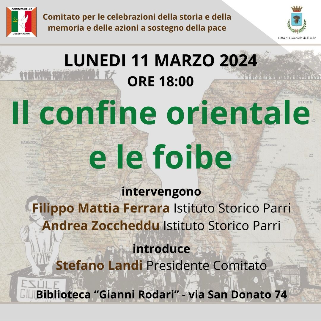 Lunedì 11 marzo, alle ore 18 in biblioteca comunale "Rodari" (via San Donato 74), il Comitato per la storia e per la memoria e delle iniziative a sostegno della pace organizza l'incontro pubblico "Il confine orientale e le foibe". Ad approfondire la storia di un territorio italiano che nel Novecento è stato centrale nelle vicende del nostro paese intervengono gli storici dell'Istituto Parri: Filippo Mattia Ferrara e Andrea Zoncheddu.