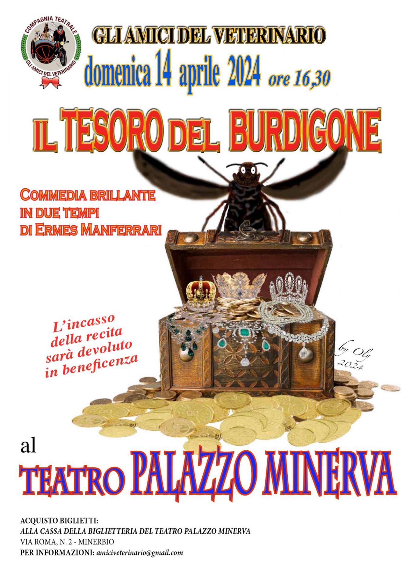 Domenica 14 aprile 2024 alle ore 16,30 presso il teatro comunale di Minerbio Palazzo Minerva, si terrà la commedia brillante in due atti di Ermes Manferrari "Il TESORO DEL BURDIGONE", con la compagnia Gli Amici del Veterinario.