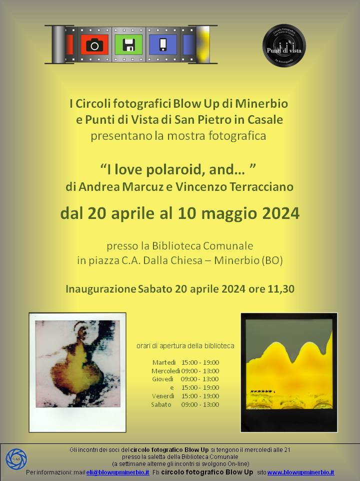 Sabato 20 aprile 2024 alle ore 11.30 in Biblioteca comunale Prometeo di Minerbio si terrà l'inaugurazione della mostra fotografica "I love polaroid, and..." di Andrea Marcuz e Vincenzo Terracciano, a cura del Circolo fotografico Blow up e Punti di vista di San Pietro in Casale.