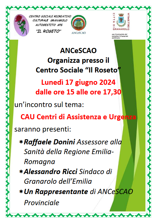Si parlerà di CAU - Centri di Assistenza e Urgenza lunedì 17 giugno a Il Roseto Centro Sociale. Appuntamento dalla 15 alle 17.30 con ANCeSCAO insieme a Raffaele Donini, assessore alla Sanità della Regione, e al sindaco Alessandro Ricci.