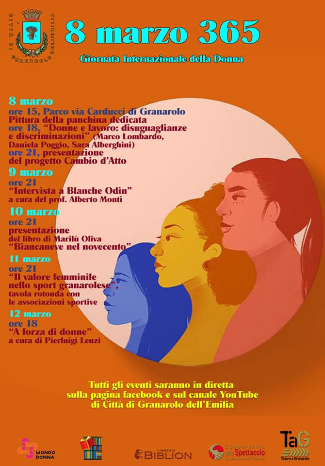 L'8 marzo, online nella pagina Facebook e sul canale Youtube Città di Granarolo dell'Emilia , si terranno queste iniziative in occasione della giornata internazionale della donna: