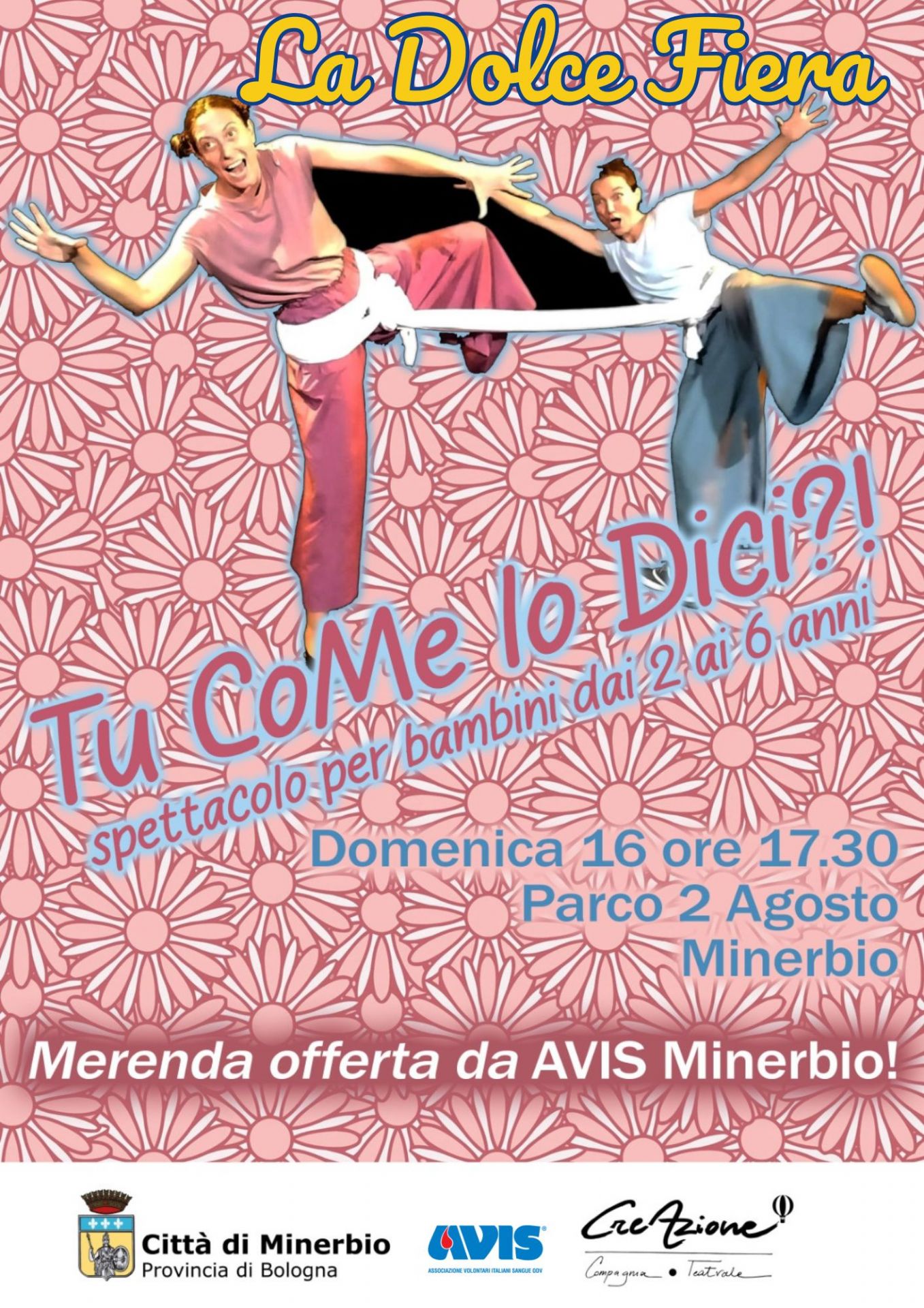 Domenica 16 giugno alle ore 17.30 al parco 2 agosto 1980, nell'ambito delle iniziative de La Dolce Fiera 2024, spettacolo per bambini dai 2 ai 6 anni "Tu come lo dici?!" di e con Compagnia teatrale CreAzione.