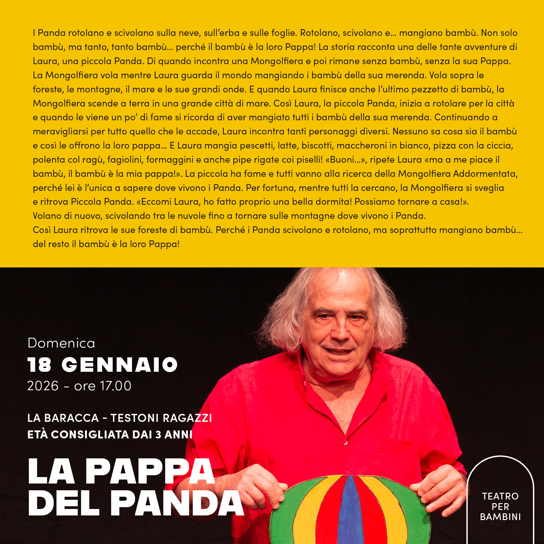 Domenica 18 gennaio 2026 alle ore 17.00 si terrà a Palazzo Minerva lo spettacolo "La Pappa del Panda", dell'Associazione Baracca / Testoni Ragazzi