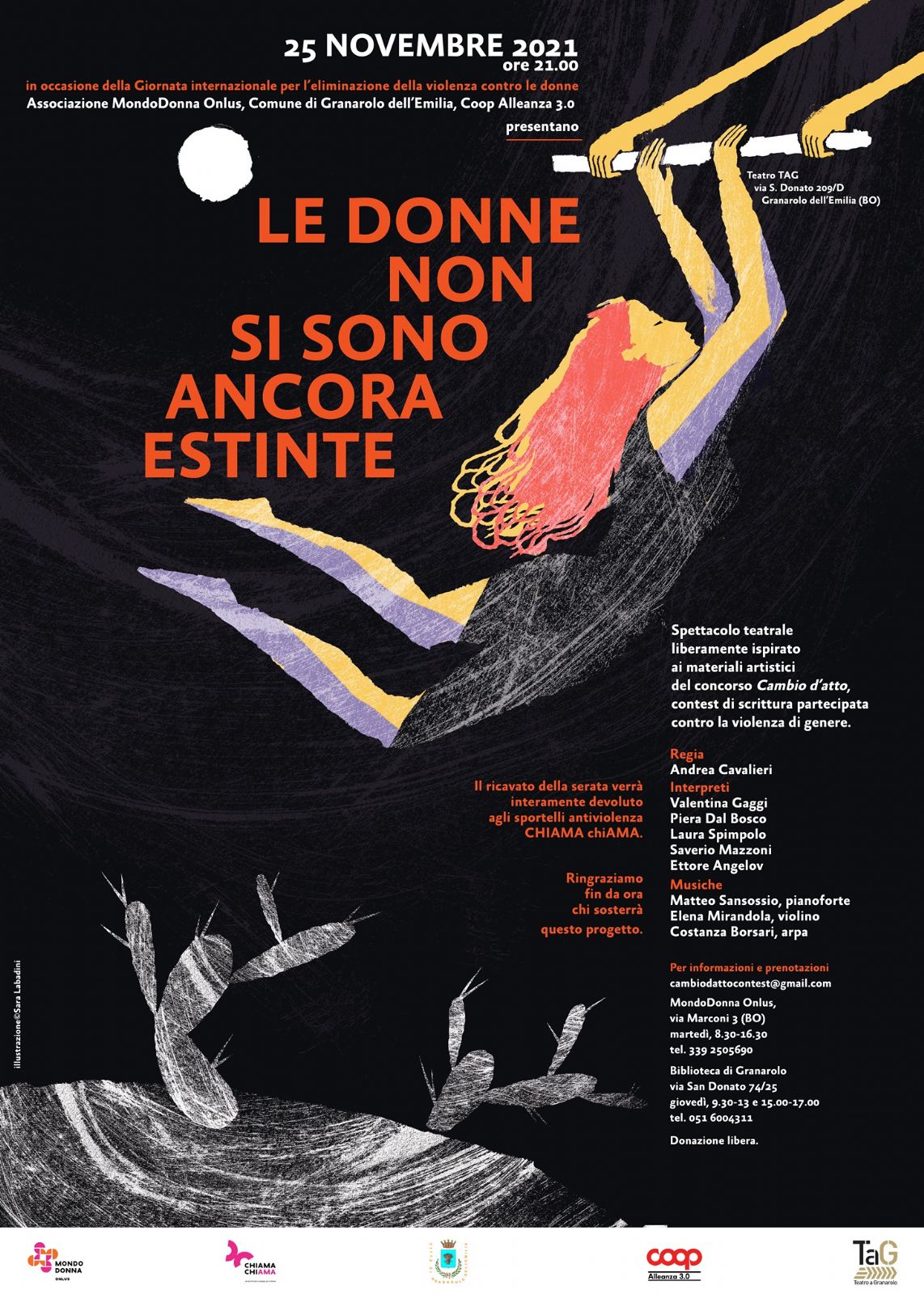 Donazione libera. Il ricavato della serata verrà interamente devoluto agli sportelli antiviolenza CHIAMA chiama.