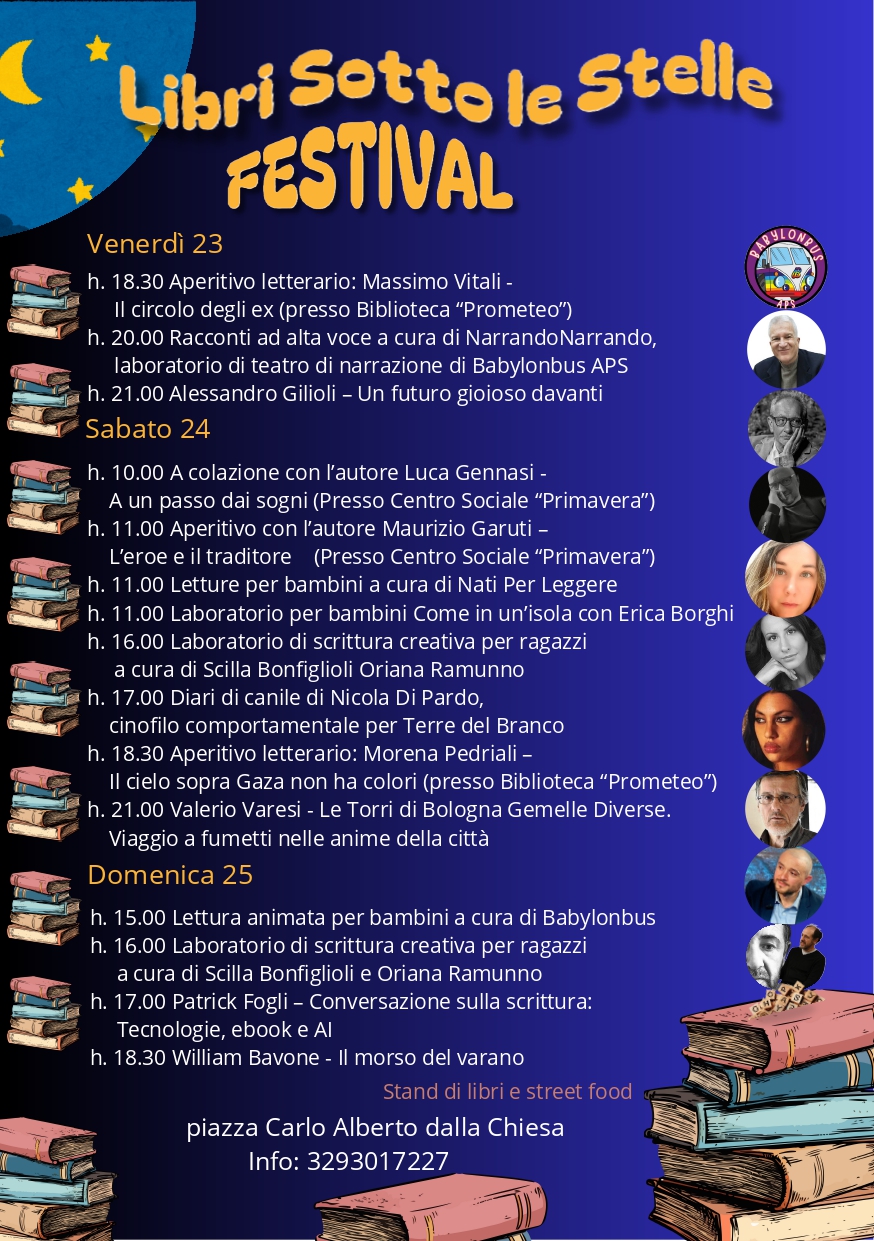 Anche quest’anno torna Libri sotto le Stelle, la rassegna culturale che celebra la passione per la letteratura e la creatività. L'evento, giunto alla sua edizione annuale, si svolgerà nelle date 23, 24 e 25 maggio in Piazza C.A. Dalla Chiesa, offrendo tre giornate ricche di incontri, letture e approfondimenti.