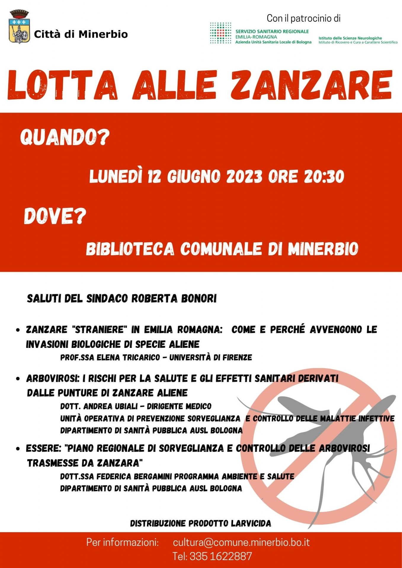 Lunedì 12 giugno 2023 alle ore 20.30 presso la Biblioteca Comunale di Minerbio (P.zza C.A. Dalla Chiesa) si terrà un incontro sul tema: Lotta alle zanzare.
