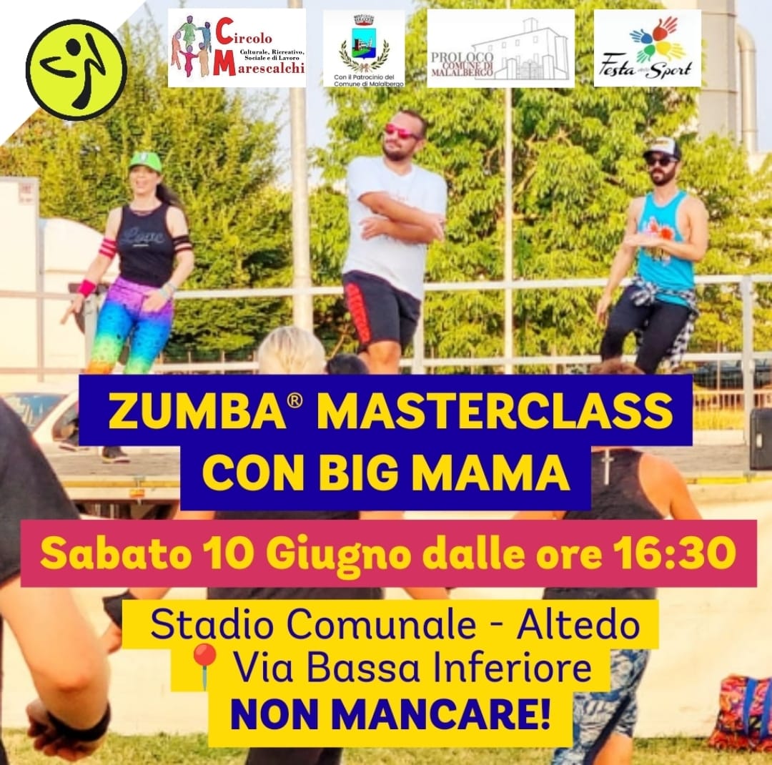 Sabato 10/06 dalle ore 16:30 nello stadio comunale di Altedo in via Bassa Inferirore si svolgerà la Masterclass di Zumba con Big Mama