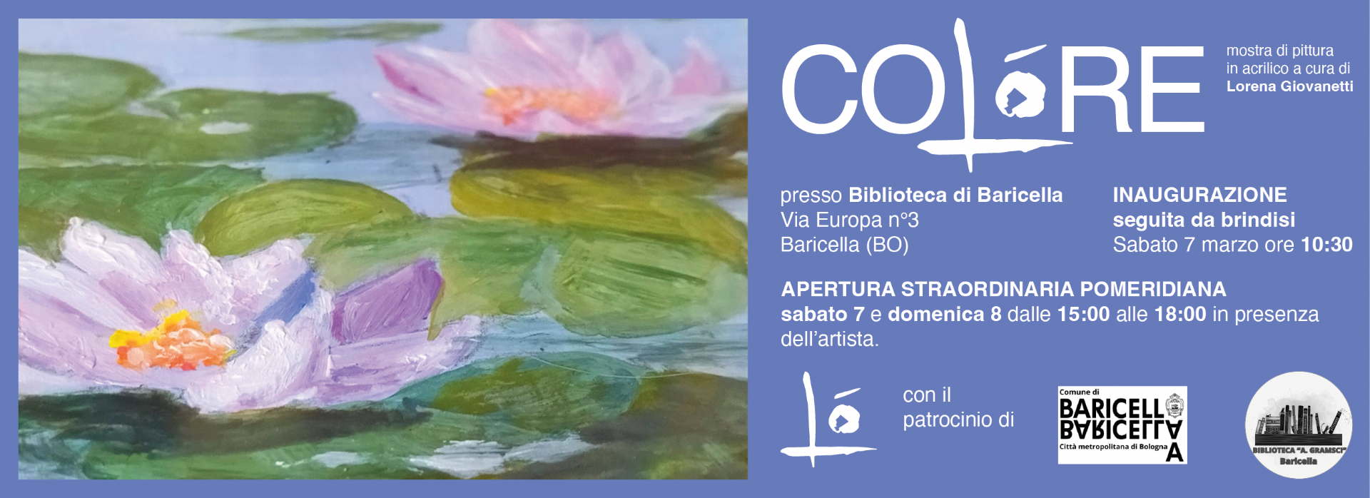 Il vernissage si terrà sabato 7 marzo alle ore 10:30 presso il Centro Culturale “Il Bargello” in Via Europa n. 3, alla presenza dell’artista e delle autorità locali con la partecipazione di Mondo Donna Onlus.