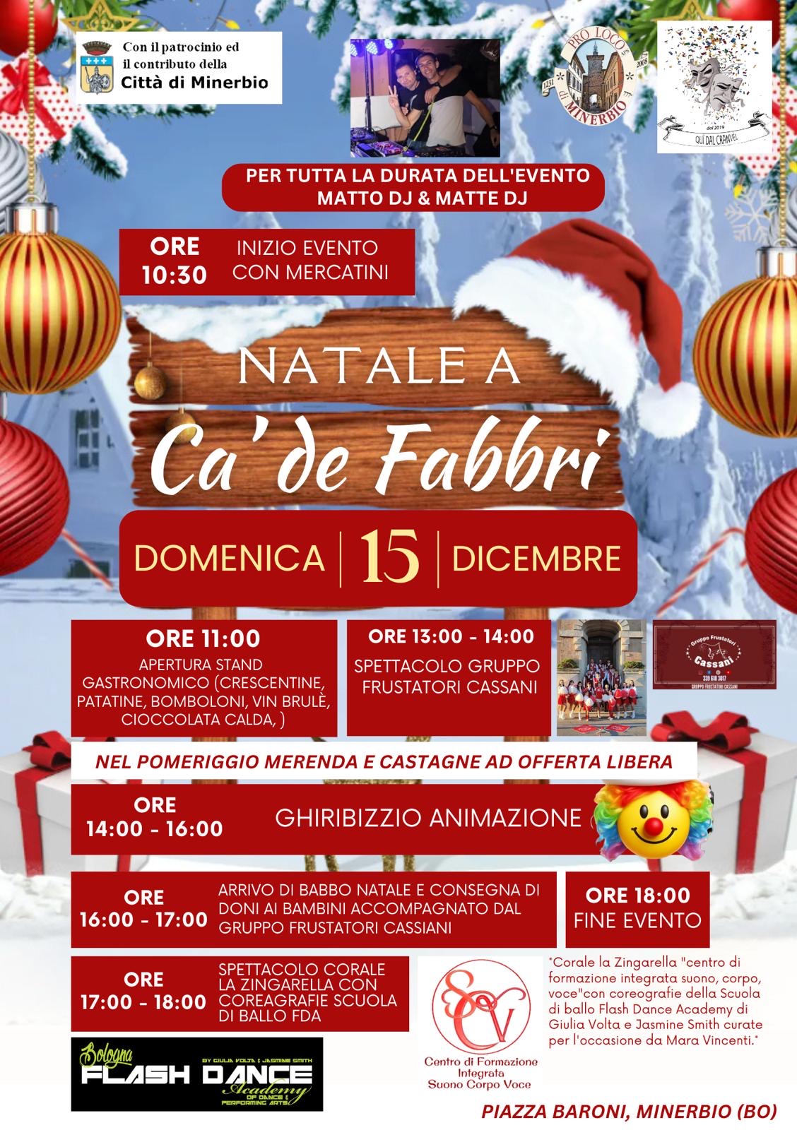 Domenica 15 dicembre si svolgerà l'evento "Natale a Ca' de' Fabbri", con il patrocinio del Comune di Minerbio, dalle ore 10.30 alle ore 18.00 in Piazza Baroni e nelle vie limitrofe, organizzato da Qui dal Cranvèl e Pro Loco di Minerbio, con dolcetti e animazione, mercatini e attività per grandi e piccini. E alle ore 16.00 arriva Babbo Natale!