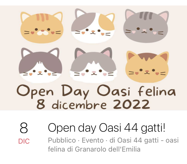 L’Oasi Felina di Granarolo sarà aperta il giorno 8 dicembre dalle 10 alle 18 per accogliere i visitatori, mostrare la struttura e gli ospiti a 4 zampe e offrire uno spuntino o una merenda e un bicchiere di buon augurio.
