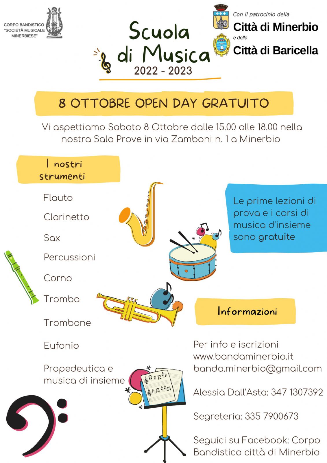 Sabato 8 ottobre 2022 dalle 15.00 alle 18.00 nella Sala Prove in via Zamboni n. 1 a Minerbio Open Day Gratuito della Scuola di Musica del Corpo Bandistico "Città di Minerbio".