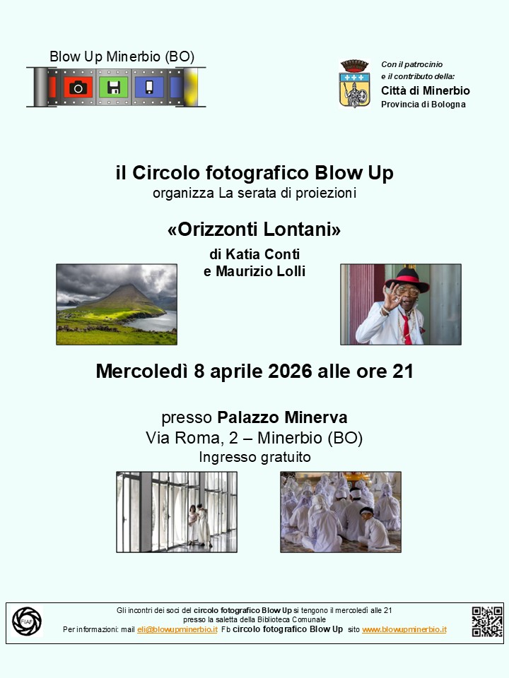 Mercoledì 8 aprile alle ore 21.00 al Teatro Palazzo Minerva - via Roma 2, Minerbio - il Circolo Fotografico Blow up, con il patrocinio del Comune di Minerbio, organizza la serata di proiezioni "Orizzonti lontani" di Katia Conti e Maurizio Lolli.