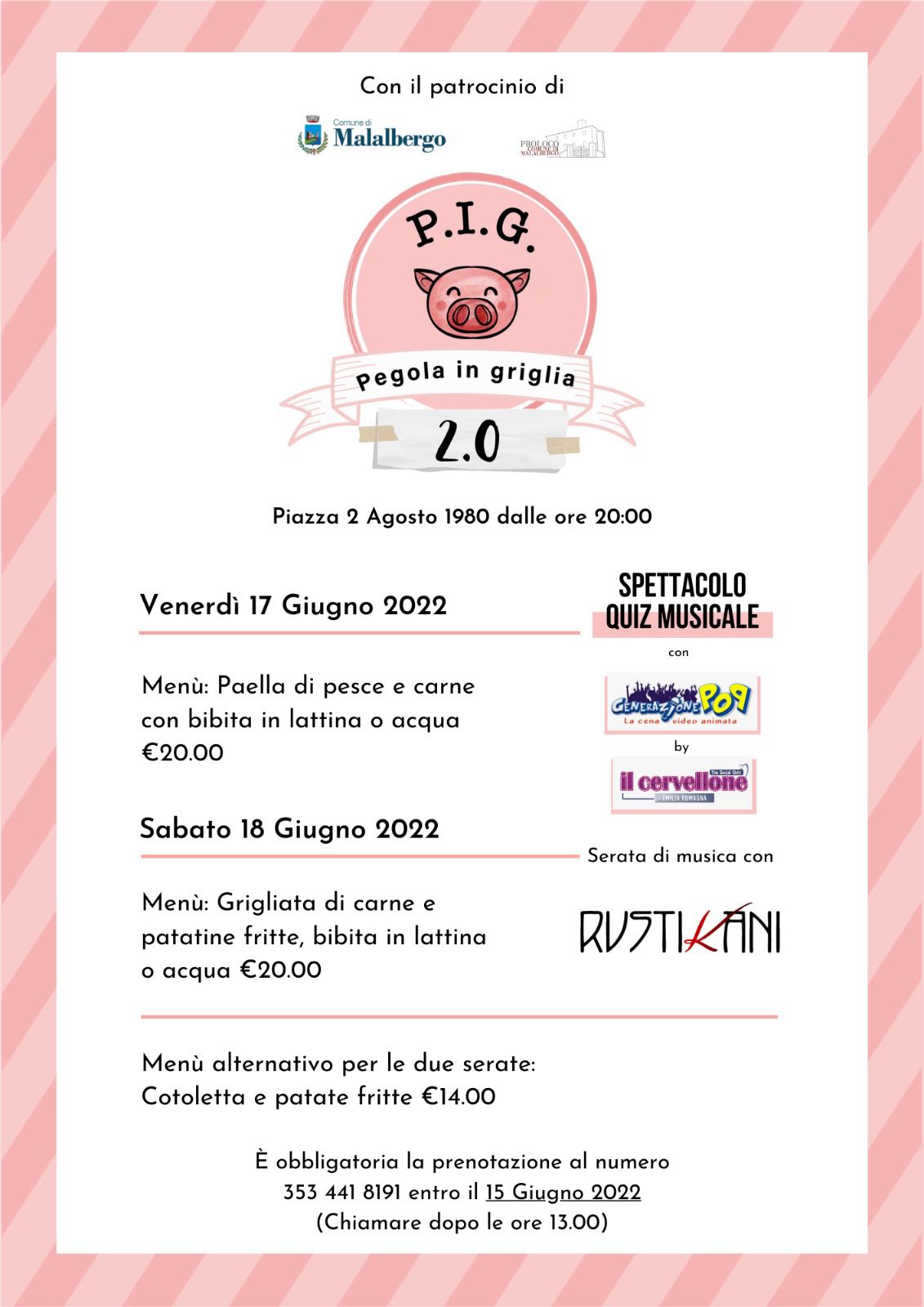 “P.I.G. PEGOLA IN GRIGLIA”, si svolgerà Venerdì 17 e Sabato 18 Giugno 2022 in Piazza 2 Agosto 1980 a Pegola, con l’obiettivo di creare un momento di aggregazione e convivialità e per raccogliere fondi per l’evento del 26 dicembre dedicato al Natale ed ai bambini “FESTA SOTTO L’ALBERO PEGOLA”.