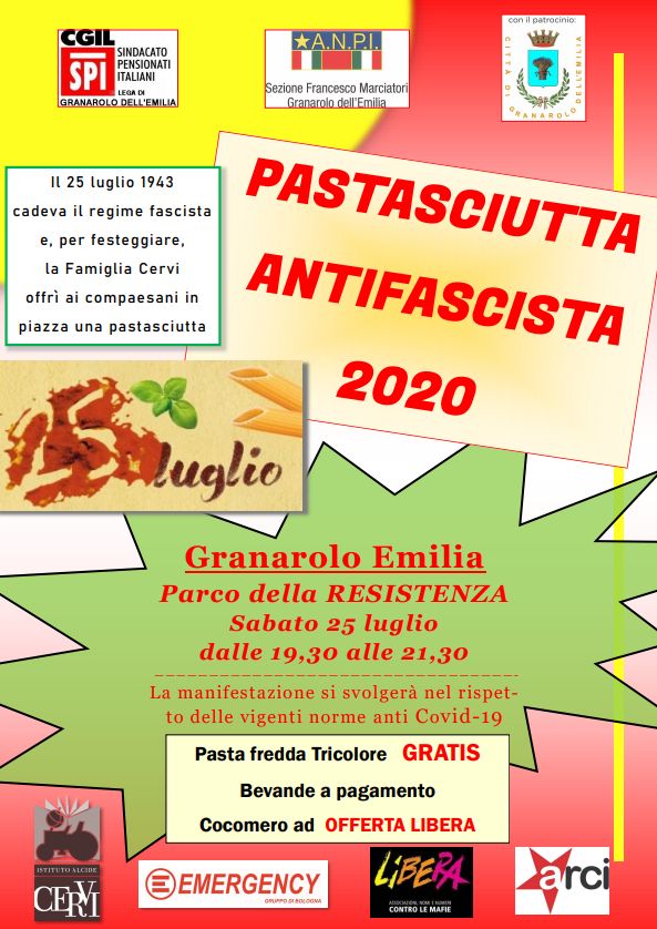 Dopo il successo riscosso dalla 1° edizione torna a Granarolo dell'Emilia - il 25 luglio dalle 19:30 alle 21:30 al Parco della Resistenza - la pastasciutta antifascista organizzata da ANPI e CGIL-SPI Granarolo, con il patrocinio del Comune di Granarolo dell'Emilia .