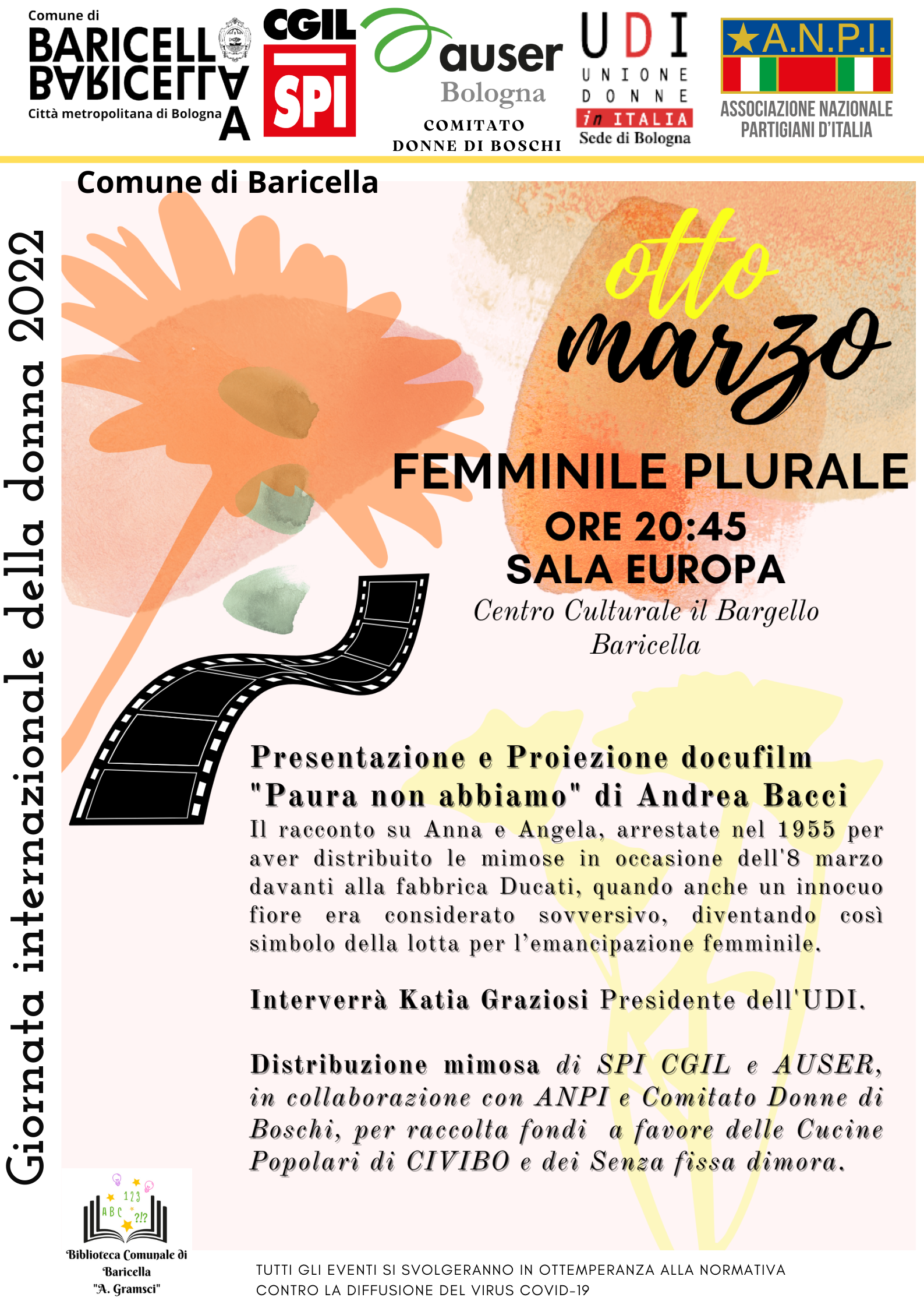Durante l'iniziativa continuerà la distribuzione della mimosa per la raccolta fondi di SPI CGIL e AUSER, in collaborazione con ANPI e Comitato Donne di Boschi, a favore delle Cucine Popolari di CIVIBO e dei Senza fissa dimora.