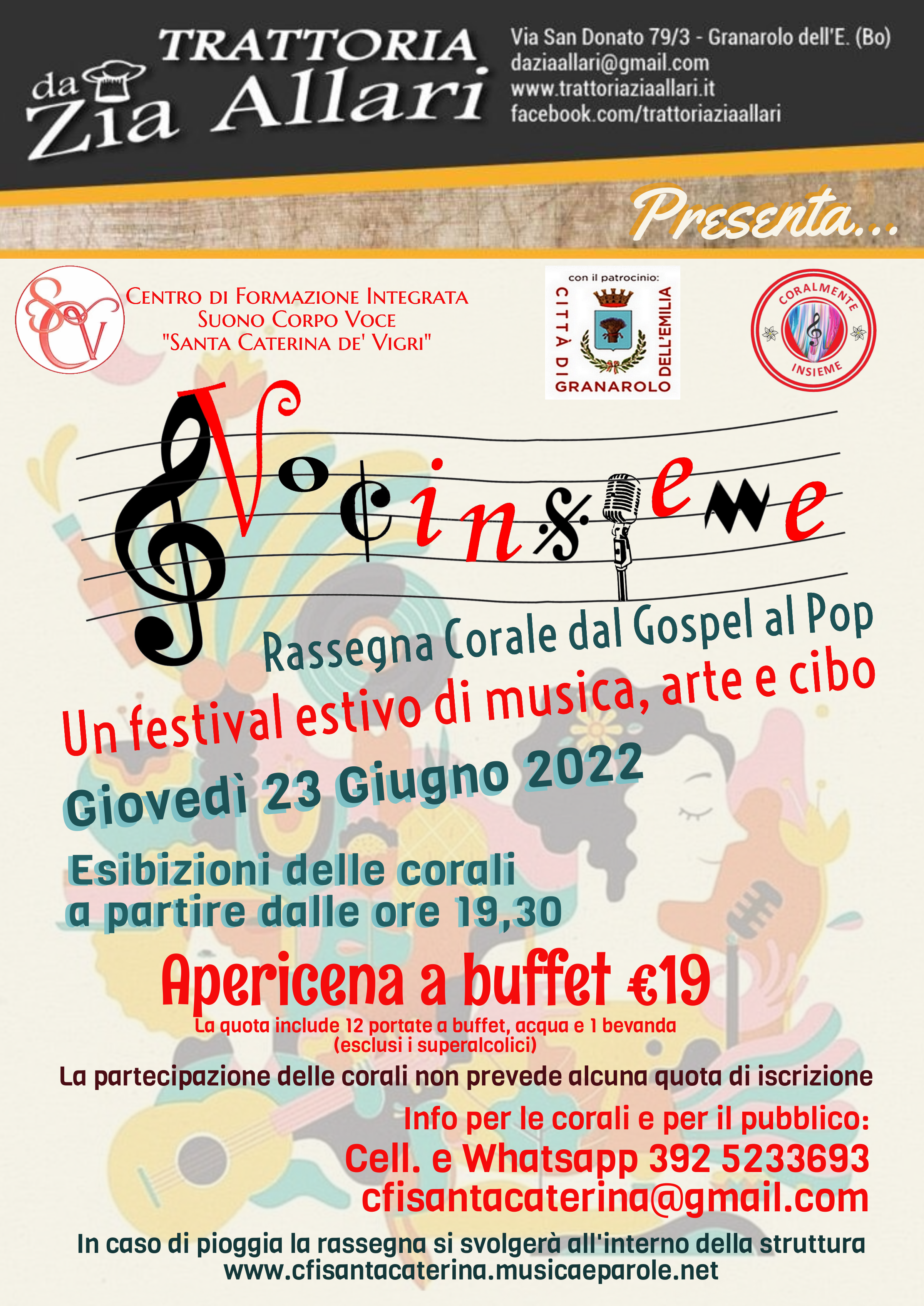 Una nuova iniziativa tutta da ascoltare e da gustare! Fortemente voluta dal Centro di Formazione Integrata “Suono Corpo Voce”, in collaborazione con il Ristorante-Trattoria "Da Zia Allari", con il Patrocinio del Comune di Granarolo dell'Emilia , nasce la Prima Edizione della Rassegna “Vocinsieme”, dedicata alle corali con repertorio pop-gospel e al connubio tra gastronomia e musica.
