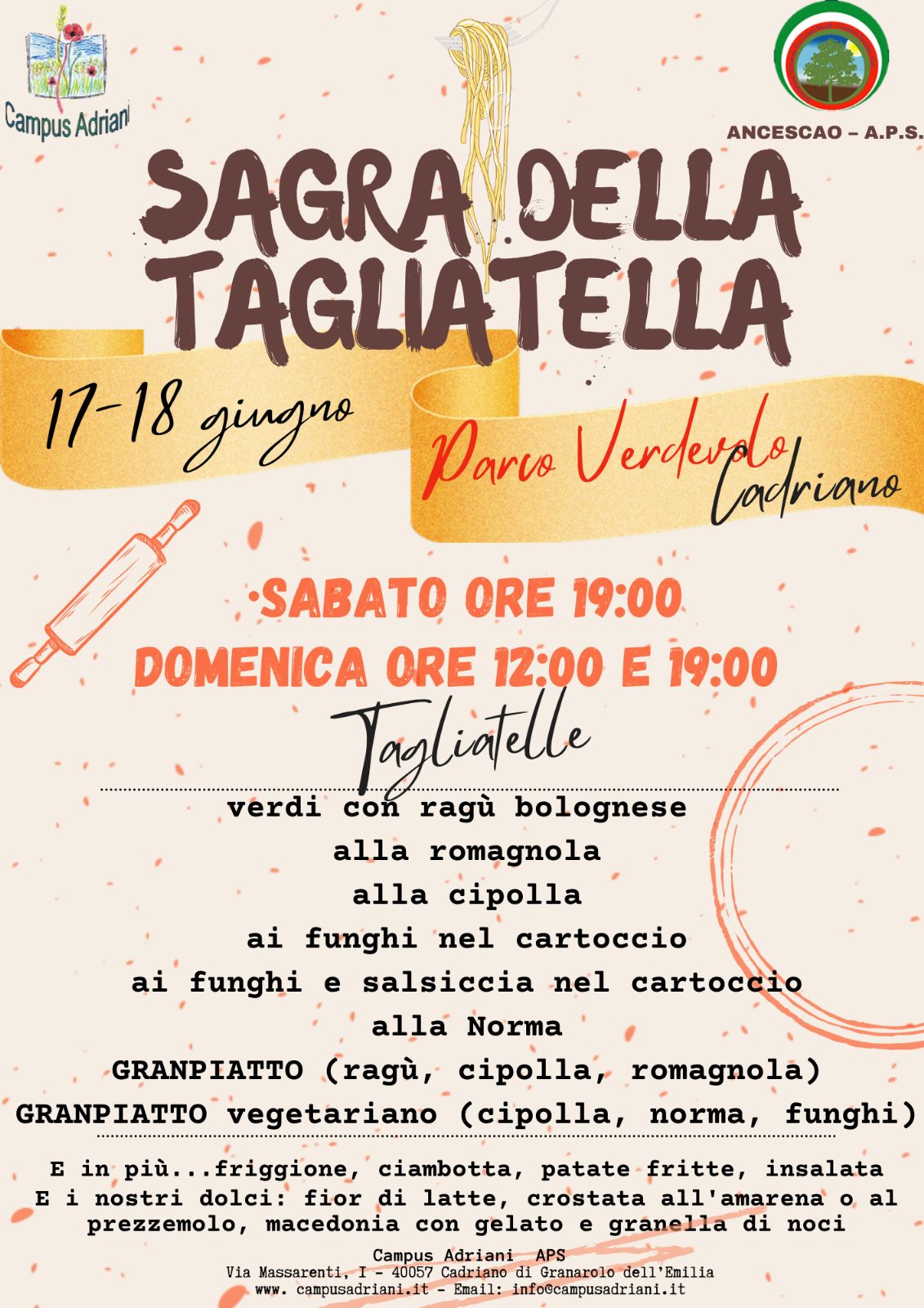 Sabato 17 giugno, dalle ore 19, e domenica 18, dalle 12 e dalle 19, l'associazione Campus Adriani in collaborazione con Ancescao organizza la "Sagra della tagliatella" al parco Verdevolo di Cadriano. Tagliatelle con tutti i condimenti e per tutti i gusti con aggiunta di contorni e dolci.