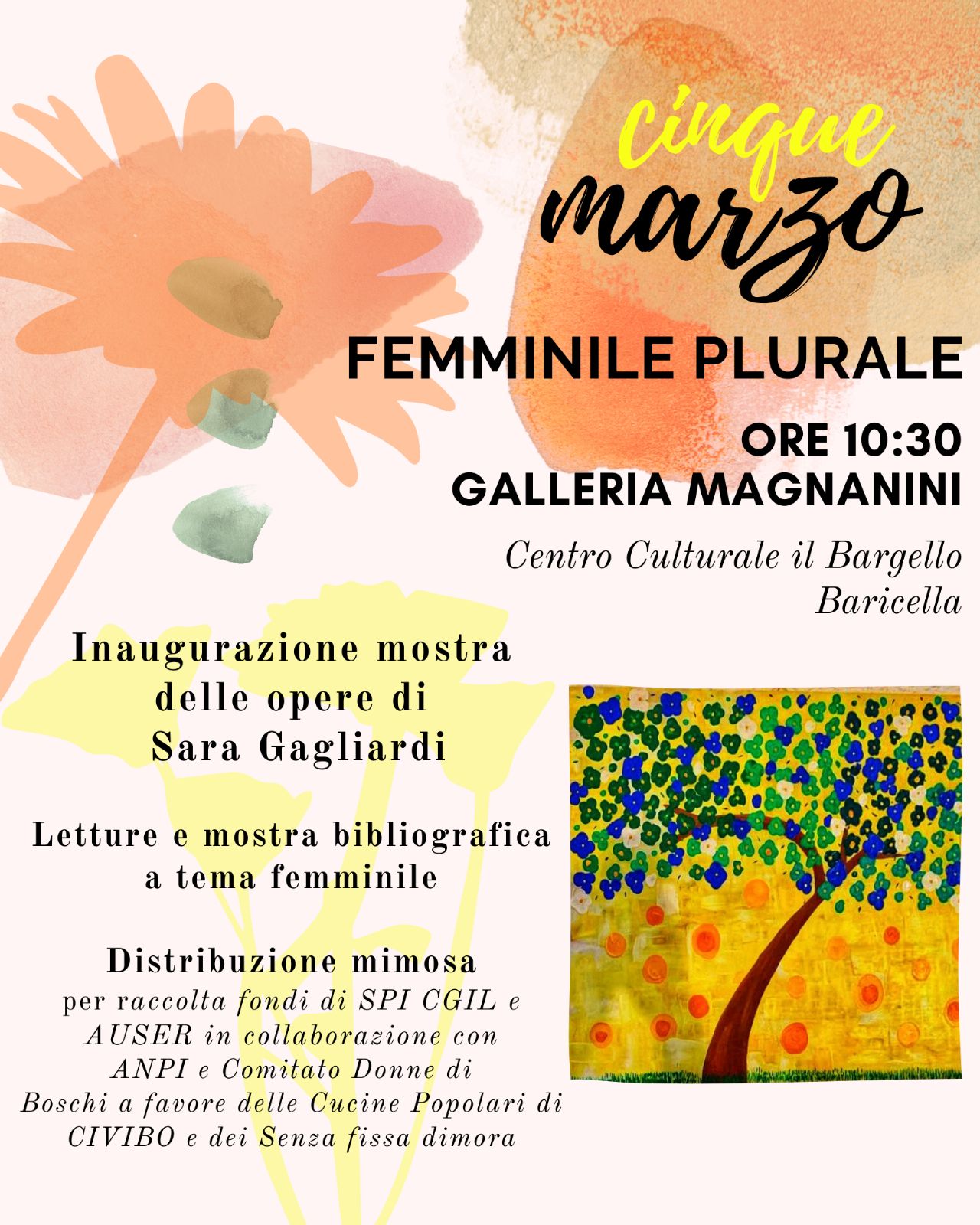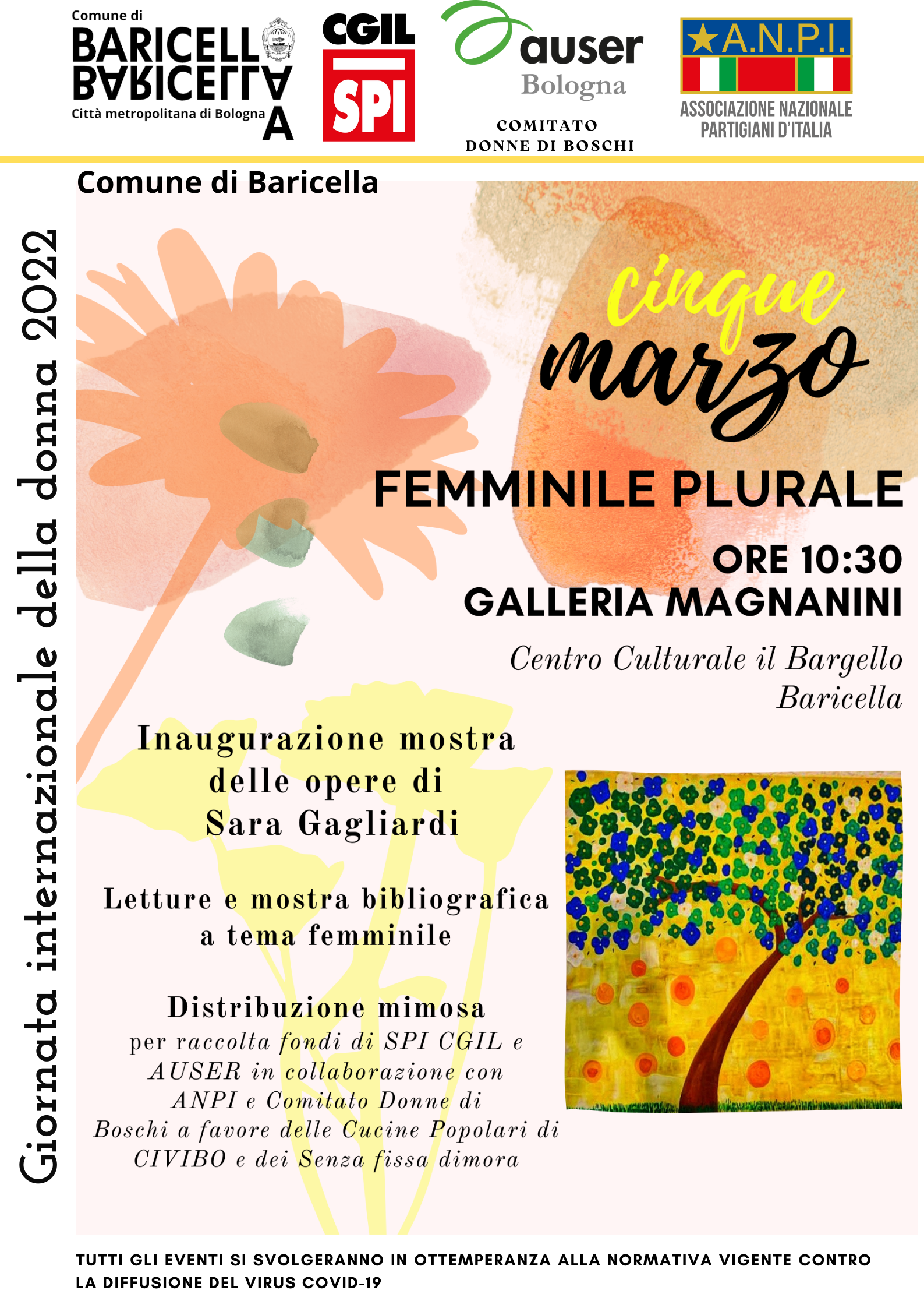 In quell’occasione Spi CGIL di Baricella, l’ Auser Baricella, in collaborazione con l’ Anpi Baricella e le Donne di Boschi, distribuiranno un ramoscello di mimosa per raccogliere fondi a favore di Cucine Popolari di CIVIBO e all'acquisto di indumenti e coperte per i senza fissa dimora.