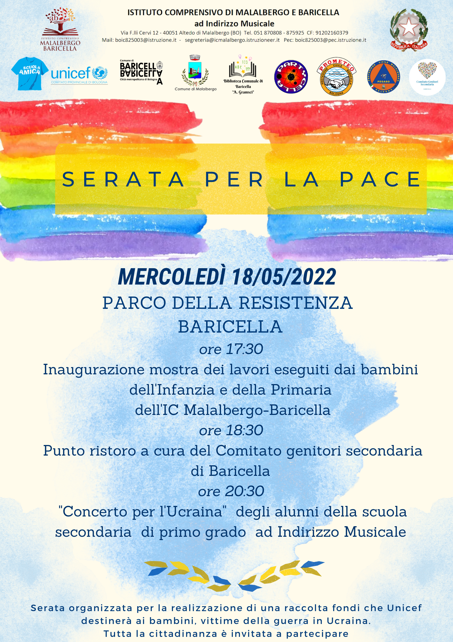 Il 18 maggio dalle ore 17:30 l'Unicef in collaborazione con l'Istituto comprensivo Malalbergo -Baricella, il Comune di Baricella e il Comune di Malalbergo organizzerà, nel parco della Resistenza, in Via Europa 1, a Baricella, la "Serata per la pace".