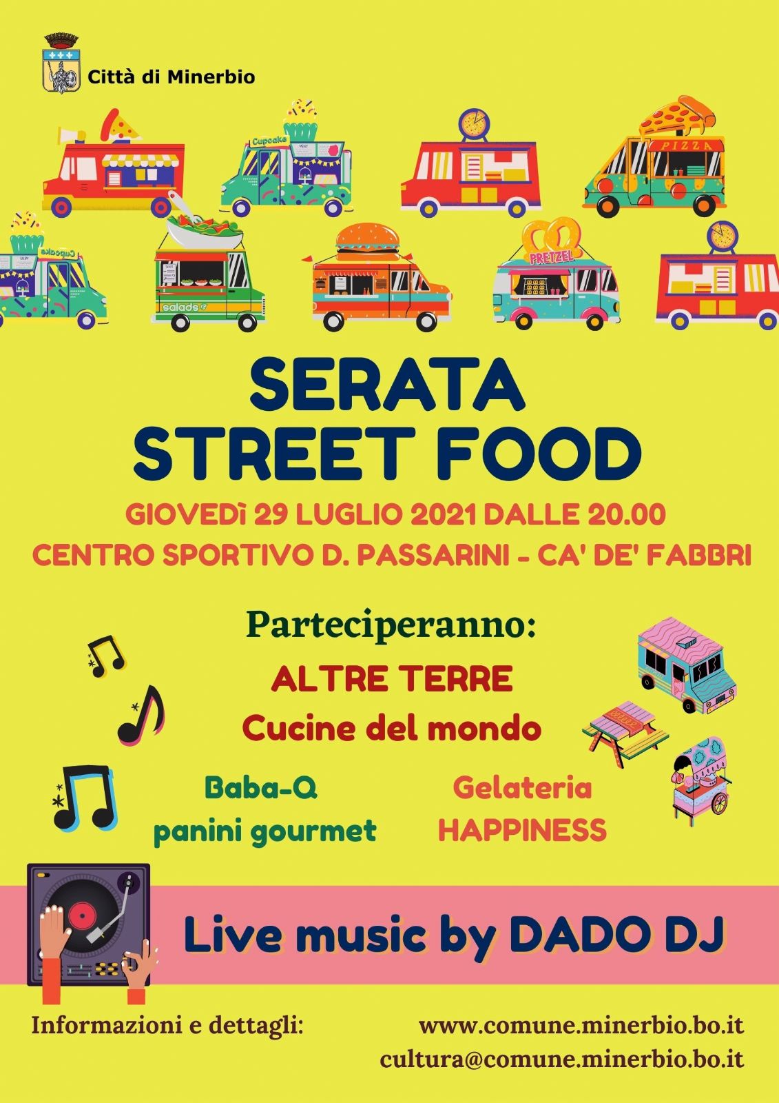 Giovedì 29 luglio, dalle ore 20.00, al Centro Sportivo D.Passarini, Serata Street Food con le proposte gastronomiche di "Altre Terre - Cucine del Mondo", "Baba-Q panini gourmet", "Gelateria Happiness".