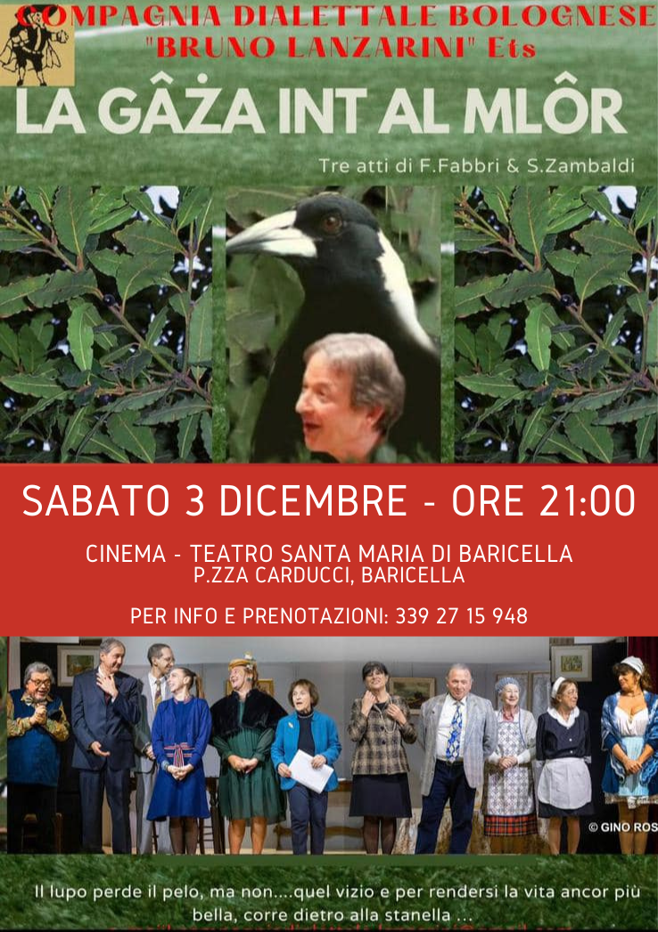 La stagione dialettale del Cinema Teatro Santa Maria di Baricella non si ferma e vi aspetta Sabato 3 Dicembre alle ore 21:00 con lo spettacolo "La gaza int al mlor". Tre atti originali bolognesi di Filippo Fanfulla e Silvio Zambaldi, con la Compagnia dialettale bolognese "Bruno Lanzarini". Dalla regia di Paolo Mazzacurati, con Paolo Mazzacurati, Laura Mnafredini, Massimo Bianconi, Patrizia Strazzari, Albertina Malferrari, Ettore Pancaldi, Roberta Montanari, Piera Gasperini, Cinzia Mazzacurati.
