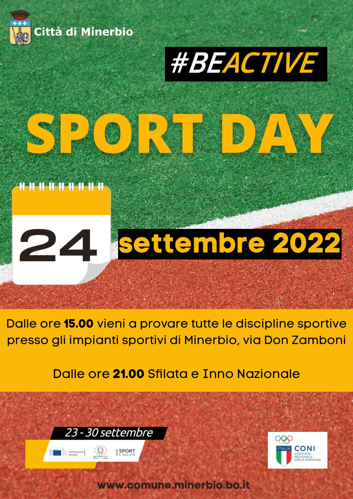 Sabato 24 settembre presso gli Impianti sportivi di Minerbio (via Don Zamboni), dalle ore 15.00 si terrà l’evento “Sport Day”, organizzato dall’Amministrazione Comunale nell’ambito della Settimana Europea dello Sport 2022, promossa dalla Commissione Europea e coordinata dall’Ufficio per lo sport della Presidenza del Consiglio dei Ministri.