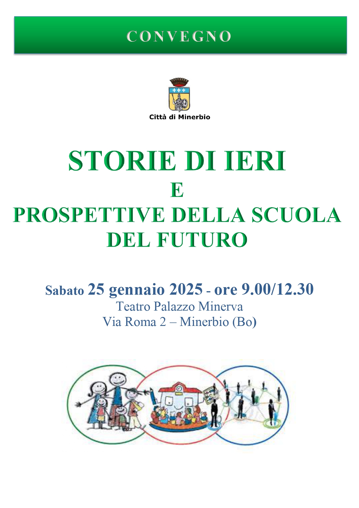 Sabato 25 gennaio 2025 dalle ore 9.00 alle ore 12.30 presso il teatro Palazzo Minerva si terrà il seminario di studi dal titolo "Storie di ieri e prospettive della scuola del futuro", organizzato dall'Istituto Comprensivo di Minerbio in collaborazione con il Comune di Minerbio.
