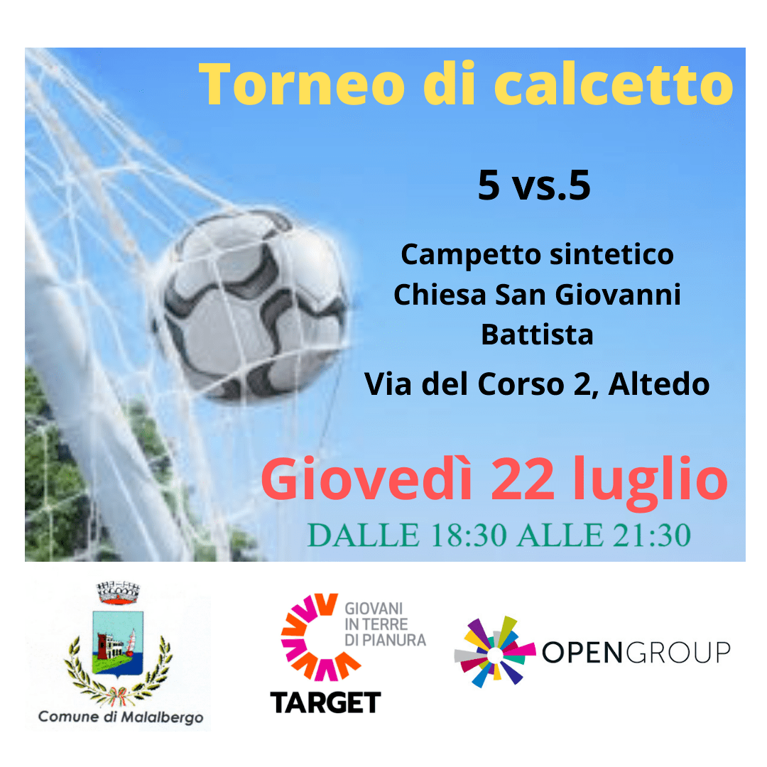 Giovedì 22 luglio dalle 18:30 alle 21:30 ad Altedo, nel campetto sintetico della Chiesa Parrocchiale San Giovanni Battista, via del Corso 2, si svolgerà un torneo di calcetto aperto a tutti i ragazzi e a tutte le ragazze del comune di Malalbergo organizzato nell'ambito del Progetto Target