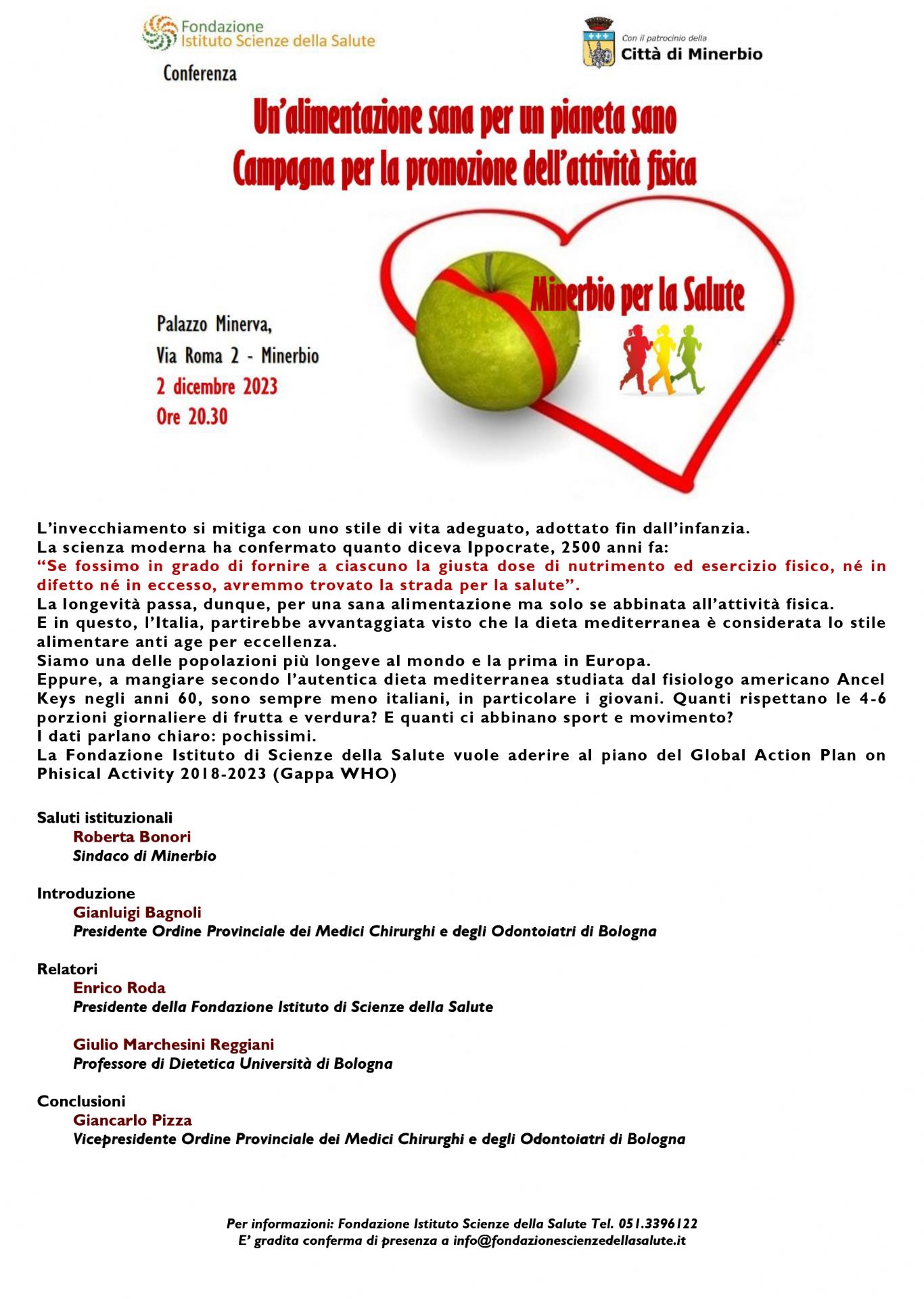 Sabato 2 dicembre, alle ore 20:30, presso Palazzo Minerva si terrà la conferenza "Un'alimentazione sana per un pianeta sano. Campagna per la promozione dell'attività fisica".