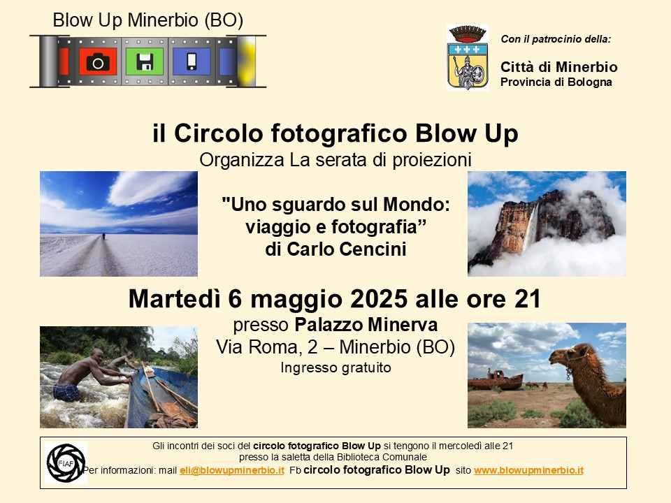 Il Comune di Minerbio è lieto di invitare la cittadinanza a partecipare alla serata dedicata alla fotografia e al viaggio, dal titolo Uno sguardo sul mondo.