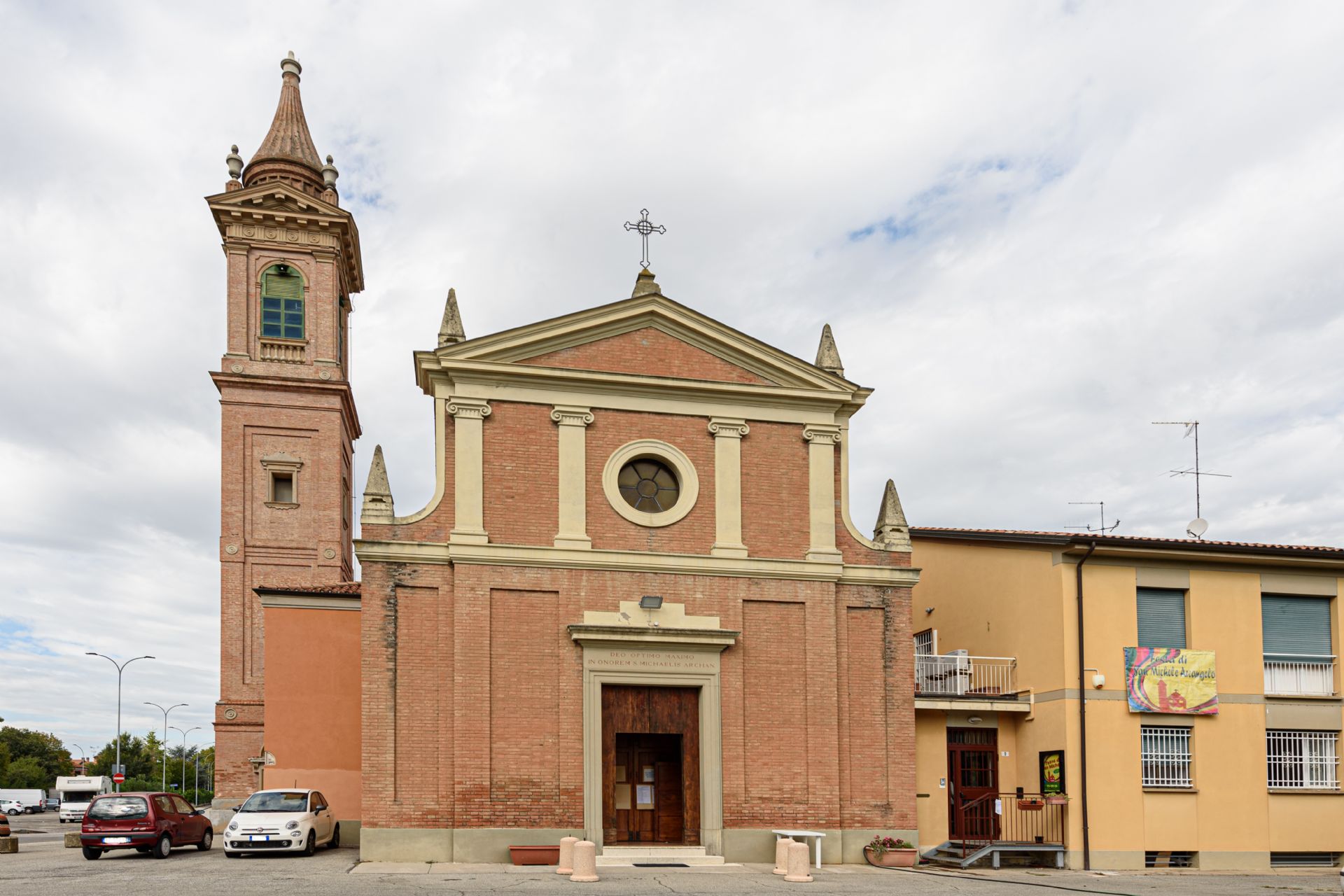 L’interno, a navata unica, con quattro cappelle, e presbiterio aperto sui lati, conserva alcuni dipinti del primo Seicento, già appartenuti alla chiesa antica. La bella tela dell’abside, raffigurante San Michele Arcangelo, è attribuita a Lorenzo Garbieri, allievo di Ludovico Carracci, incline a rappresentare le più sadiche scene di martirologio cristiano.