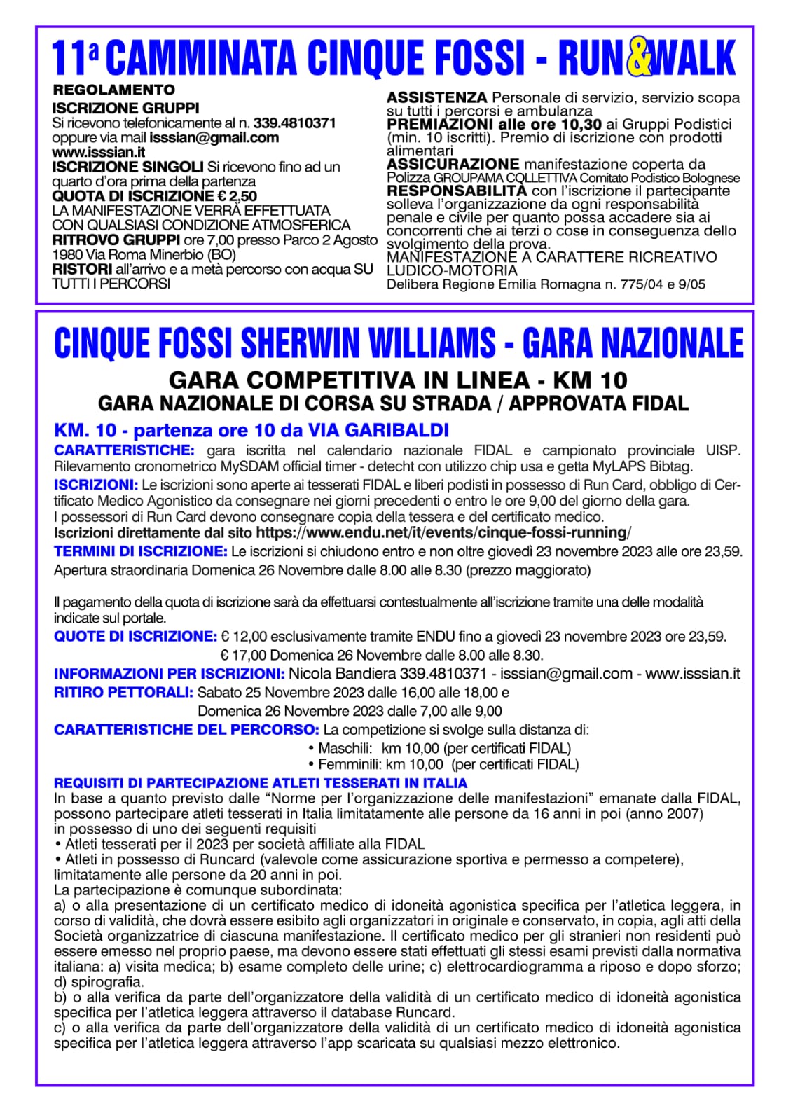 Domenica 26 Novembre torna l'11ᵃ edizione della "Cinque fossi-RUN&WALK" e Cinque fossi Sherwin Williams-Gara nazionale.