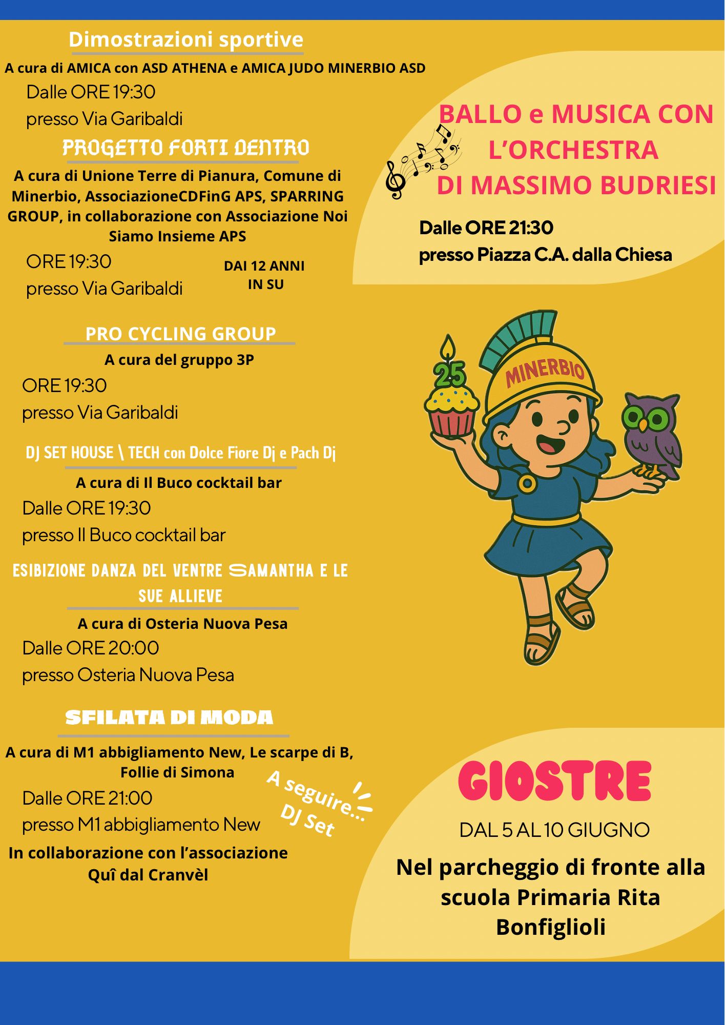 - gazebo promozionali di : ODV Protezione Civile Volontari Minerva, Bautique, Banchetto della Solidarietà, Unità Past Minerbio, Centro Culturale G. La Pira APS, Avis Minerbio ODV, GSD il Centauro APS con stand gastronomico, Assistenza pubblica La Ninfea ODV, APS CreAzione per Box61, Istituto Ramazzini