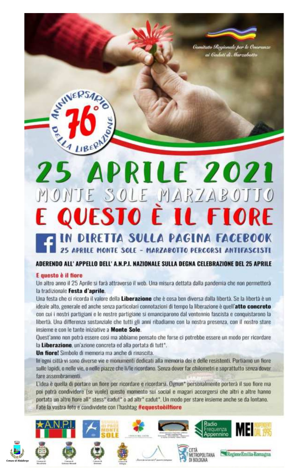 "Un fiore! Simbolo di memoria ma anche di rinascita" - l'A.N.P.I. sezione di Malalbergo, con il Patrocinio del Comune, aderisce all'appello Nazionale sulla degna celebrazione del 25 Aprile.