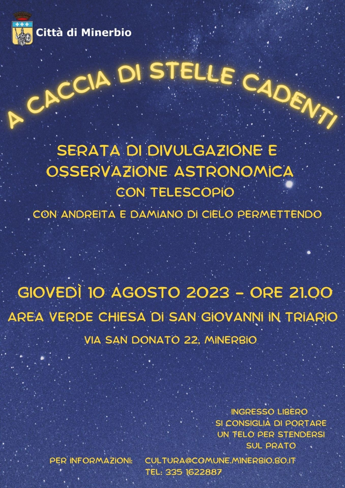 Giovedì 10 agosto 2023 alle ore 21.00 presso il prato antistante la Chiesa di San Giovanni in Triario (via San Donato 22, Minerbio), in occasione della notte di San Lorenzo, l'associazione Cielo Permettendo condurrà una serata di divulgazione e osservazione astronomica, con telescopio.