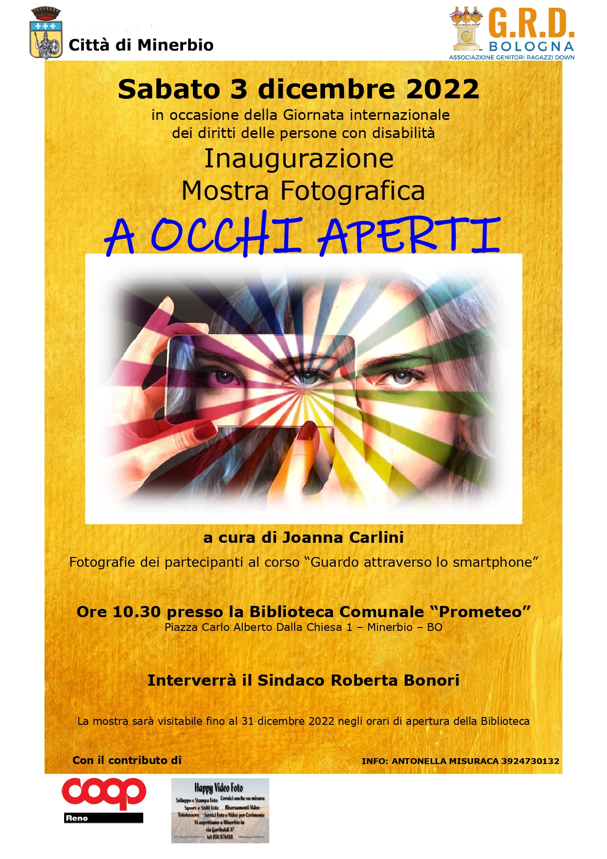 Sabato 3 dicembre 2022, in occasione della Giornata internazionale dei diritti delle persone con disabilità, alle ore 10.30 presso la Biblioteca Comunale "Prometeo" si terrà l' inaugurazione della mostra fotografica, a cura di Joanna Carlini, "A occhi aperti" - fotografie dei partecipanti al corso "Guardo attraverso smartphone" tenutosi presso la Biblioteca a ottobre e novembre.