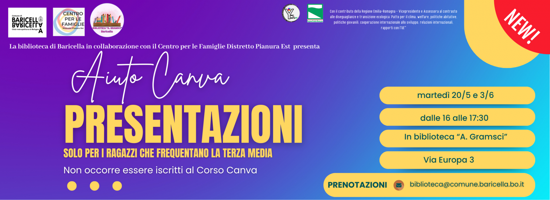 La partecipazione è gratuita ma per iscriverti è necessario inviare una mail a biblioteca@comune.baricella.bo.it allegando il modulo in calce debitamente compilato e firmato (da non inviare se si era iscritti al corso base canva), prenotando uno slot di 30'.