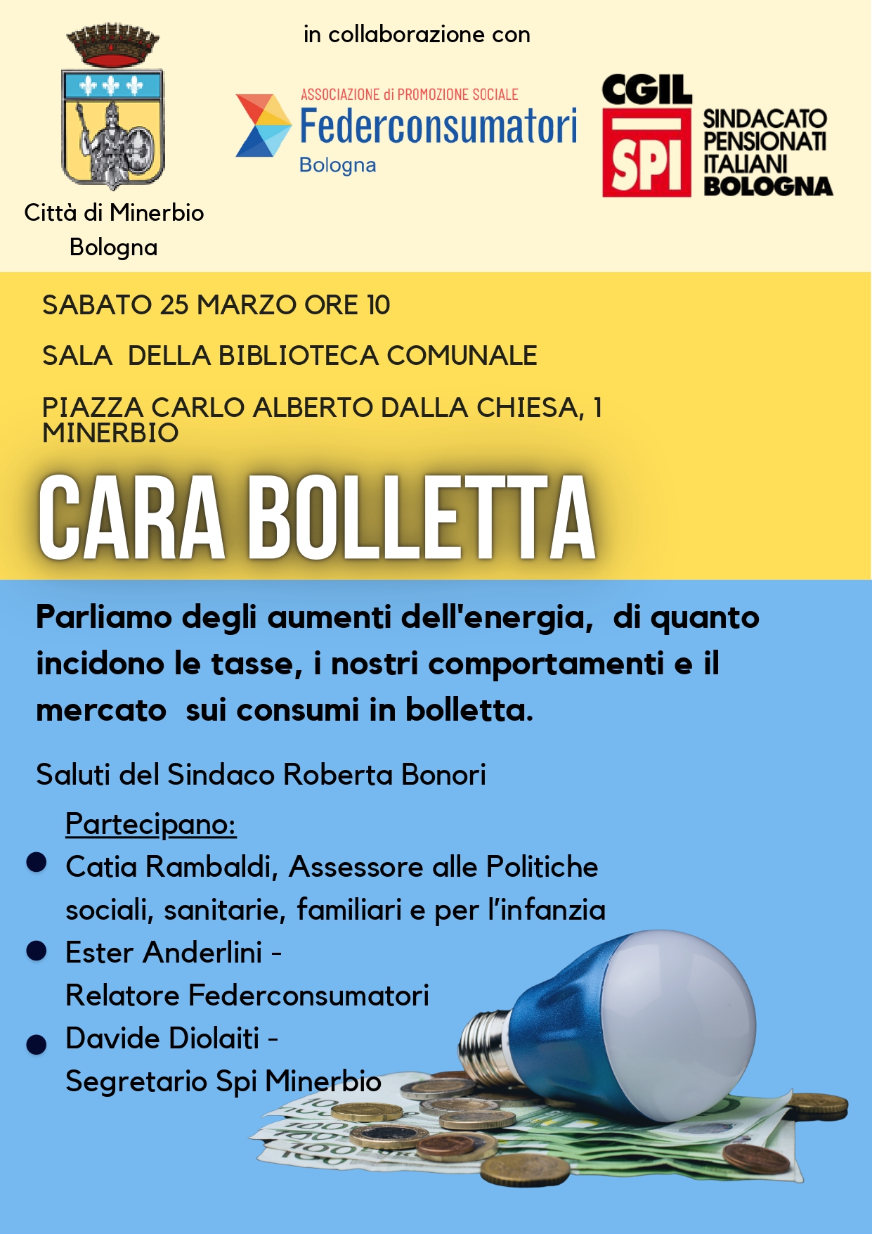 Sabato 25 marzo alle ore 10:00 presso la Saletta della Biblioteca comunale "Prometeo" si svolgerà l'incontro "Cara bolletta" in collaborazione con Federconsumatori e CGIL - SPI Bologna.