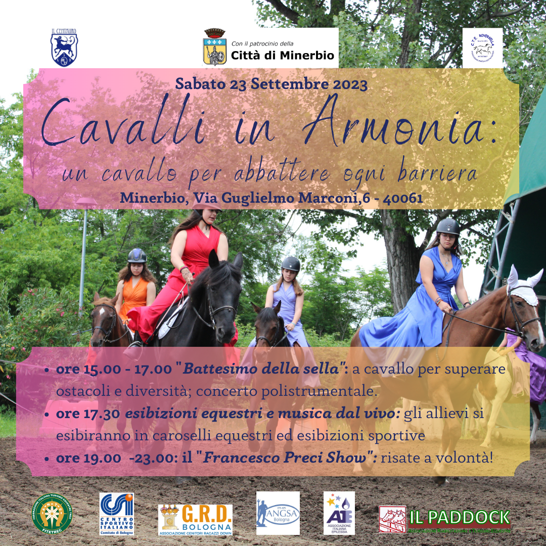 Sabato 23 settembre 2023 dalla ore 15.00 a Minerbio in via G. Marconi 6, si svolgerà l'iniziativa gratuita "Cavalli in armonia. un cavallo per abbattere ogni barriera", organizzata da GSD il Centauro Aps.
