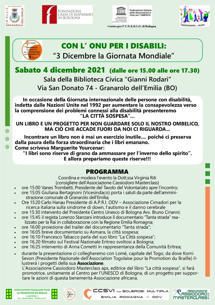 L'Associazione “CCSVI NELLA SCLEROSI MULTIPLA – EMILIA ROMAGNA ODV”, che ha sede a Granarolo dell’Emilia, organizza sabato 4 dicembre la presentazione del libro dal titolo “La città sospesa: un libro e un progetto per non guardare solo il nostro ombelico, ma ciò che accade fuori da noi ci riguarda…..”.