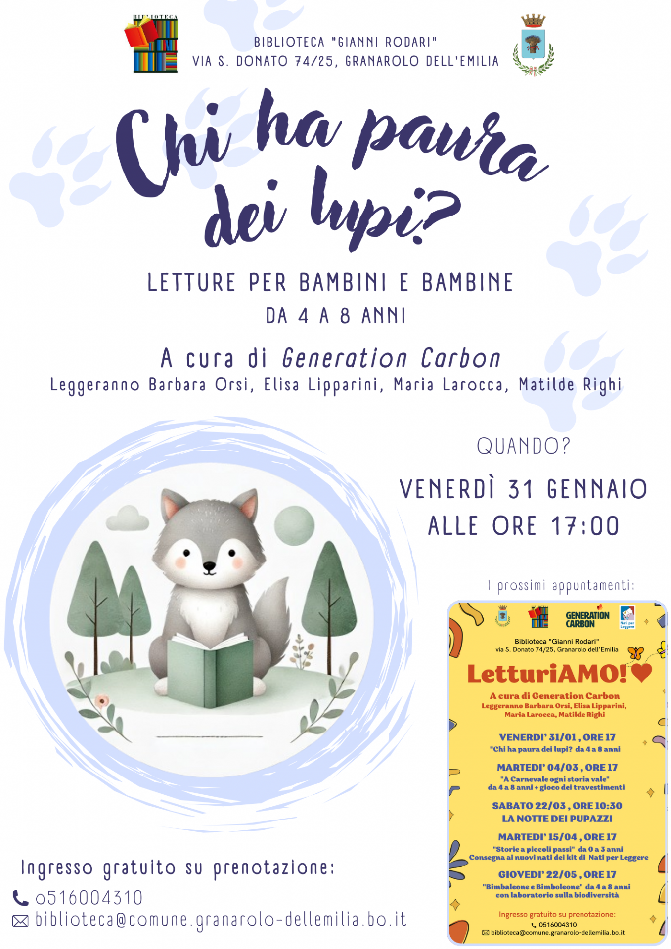 A cura di Generation Carbon, Barbara Orsi, Elisa Lipparini, Maria Larocca e Matilde Righi leggeranno storie affascinanti e coinvolgenti per bambini e bambine dai 4 agli 8 anni.